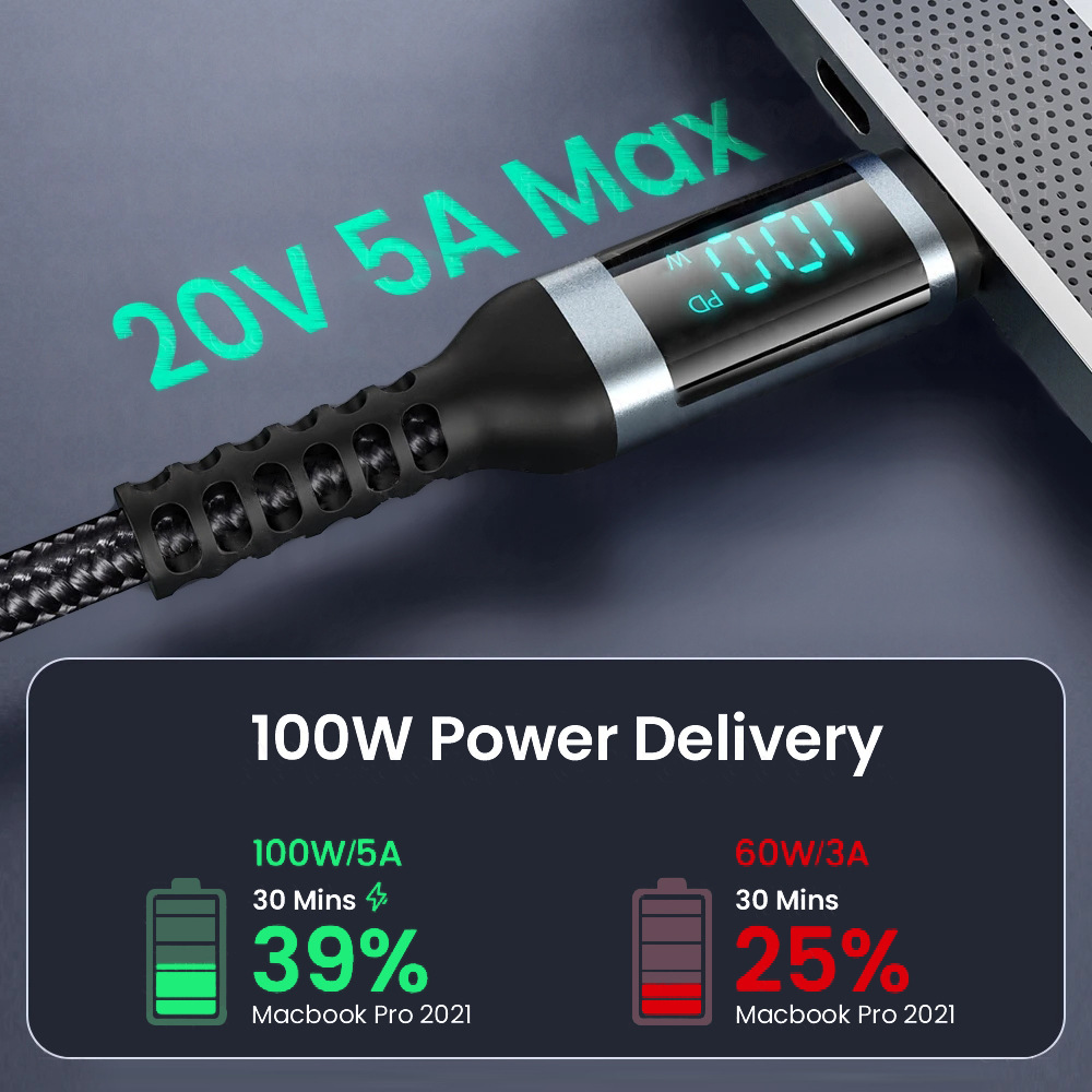 100W digital display fast charging data cable suitable for mobile phones and computers, dual Type-C male-to-male fast charging cable, 100W digital display