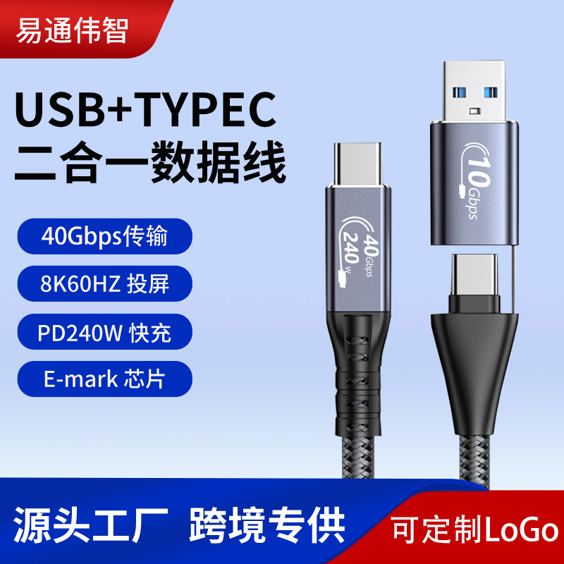 USB4.0 2-in-1 External Hard Drive Data Cable, 40Gbps Transmission, PD 240W Fast Charge, 8K Display, Full-Featured Cable