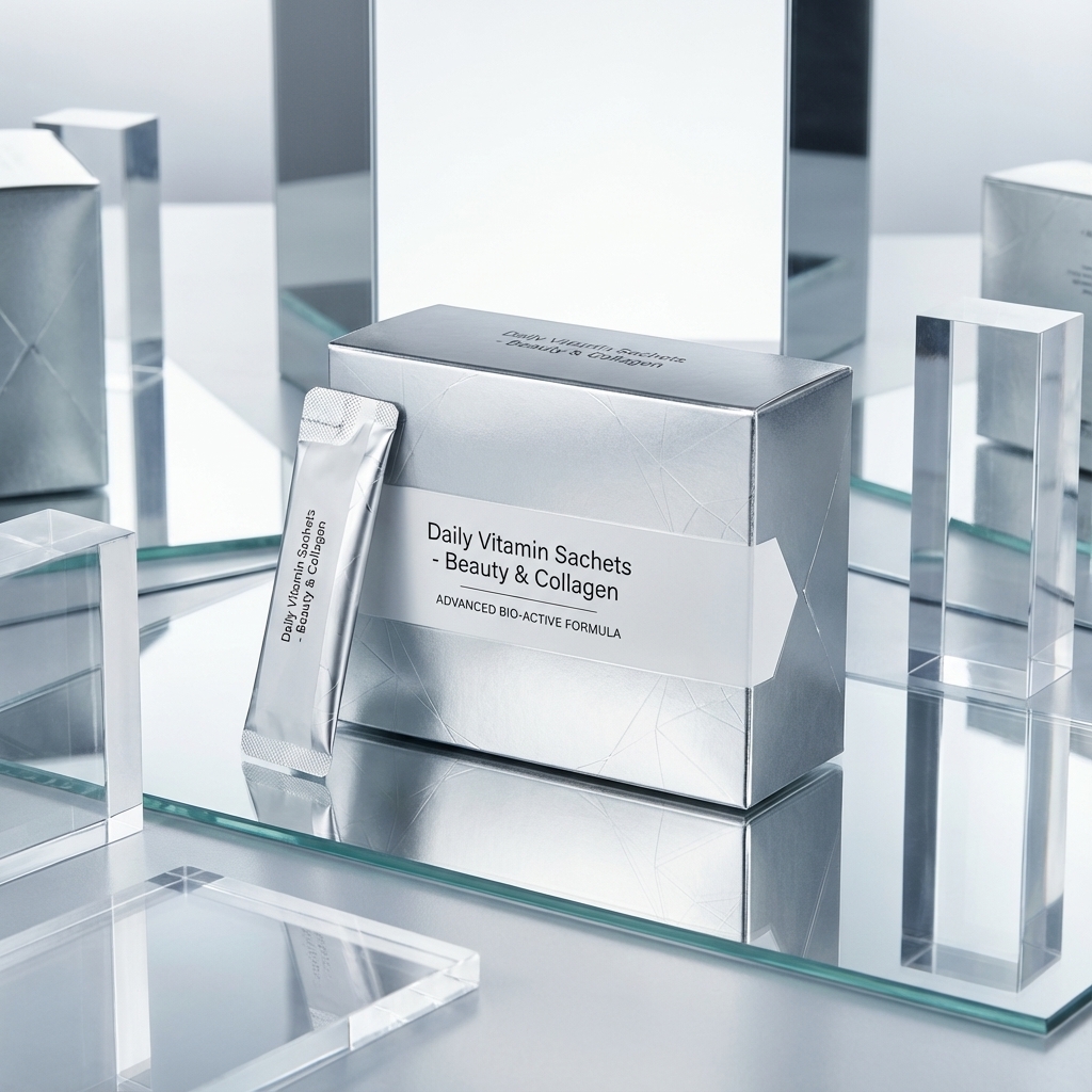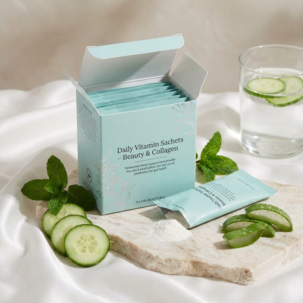 AI-generated product visualizations for Beauty & Collagen Sachets