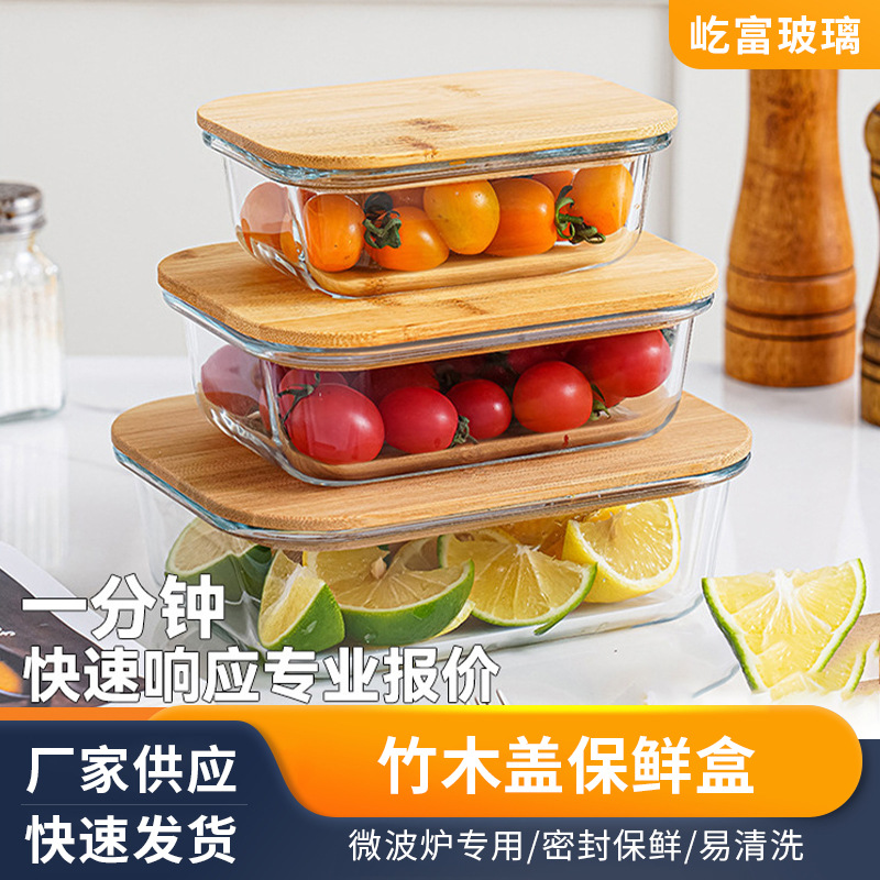Spot Bamboo and Wood Lid Glass Lunch Box Sealed Crisper Microwave Heating Transparent Lunch Box Bowl Insulated Lunch Box