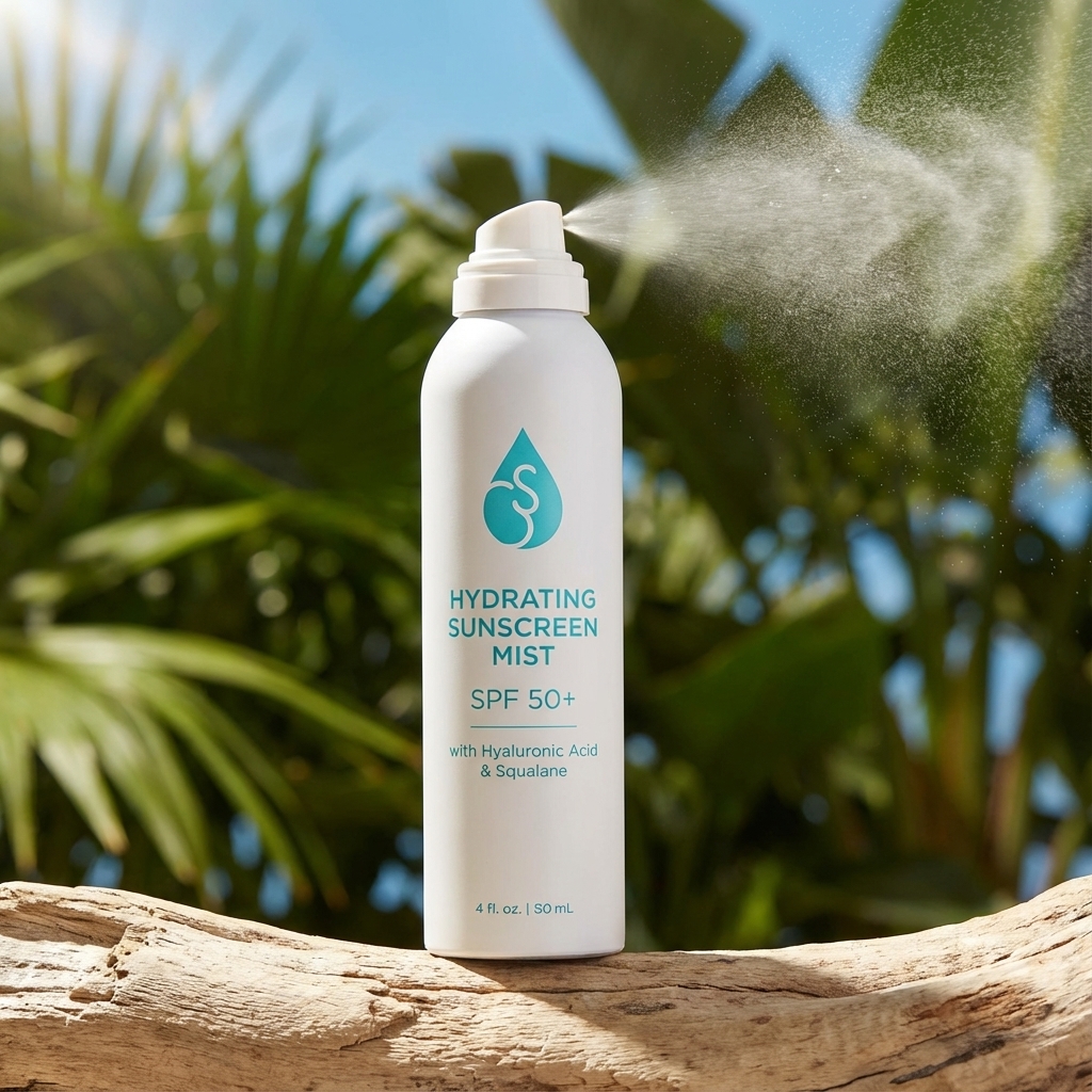 AI-generated product visualizations for Hydrating Sunscreen Mist