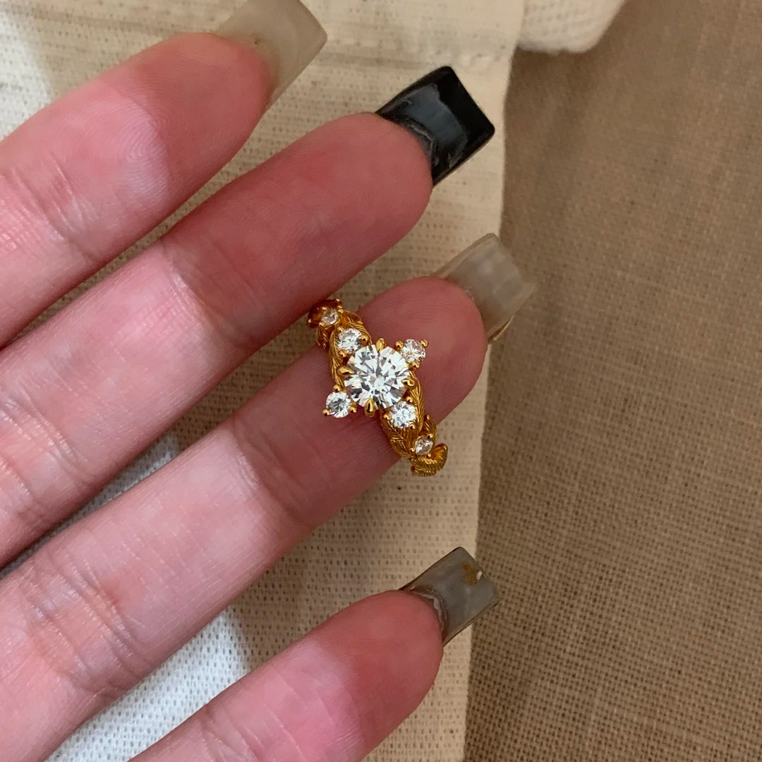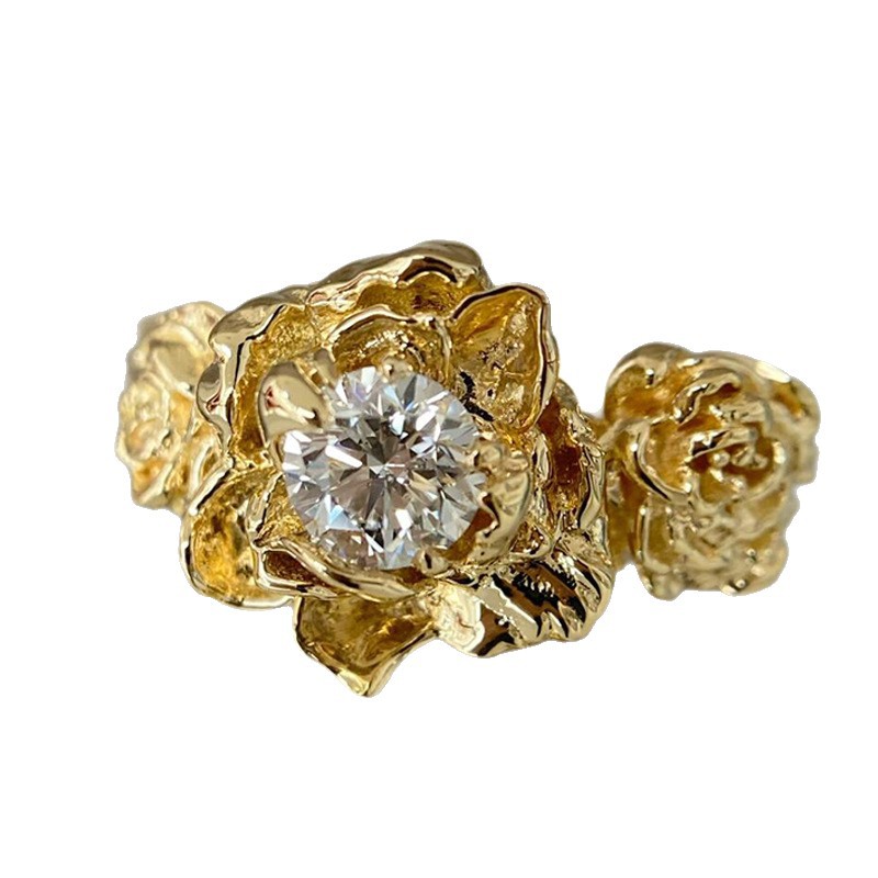 French-Style Gold-Colored Rose Sparkling Zircon Ring for Women, Vintage Niche Design, Versatile Fashion Retro Index Finger Ring