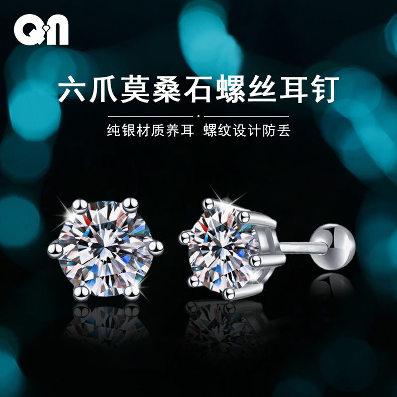 Men's and women's s925 sterling silver screw thread earring classic six-claw earring female 1 karat moissanite earring