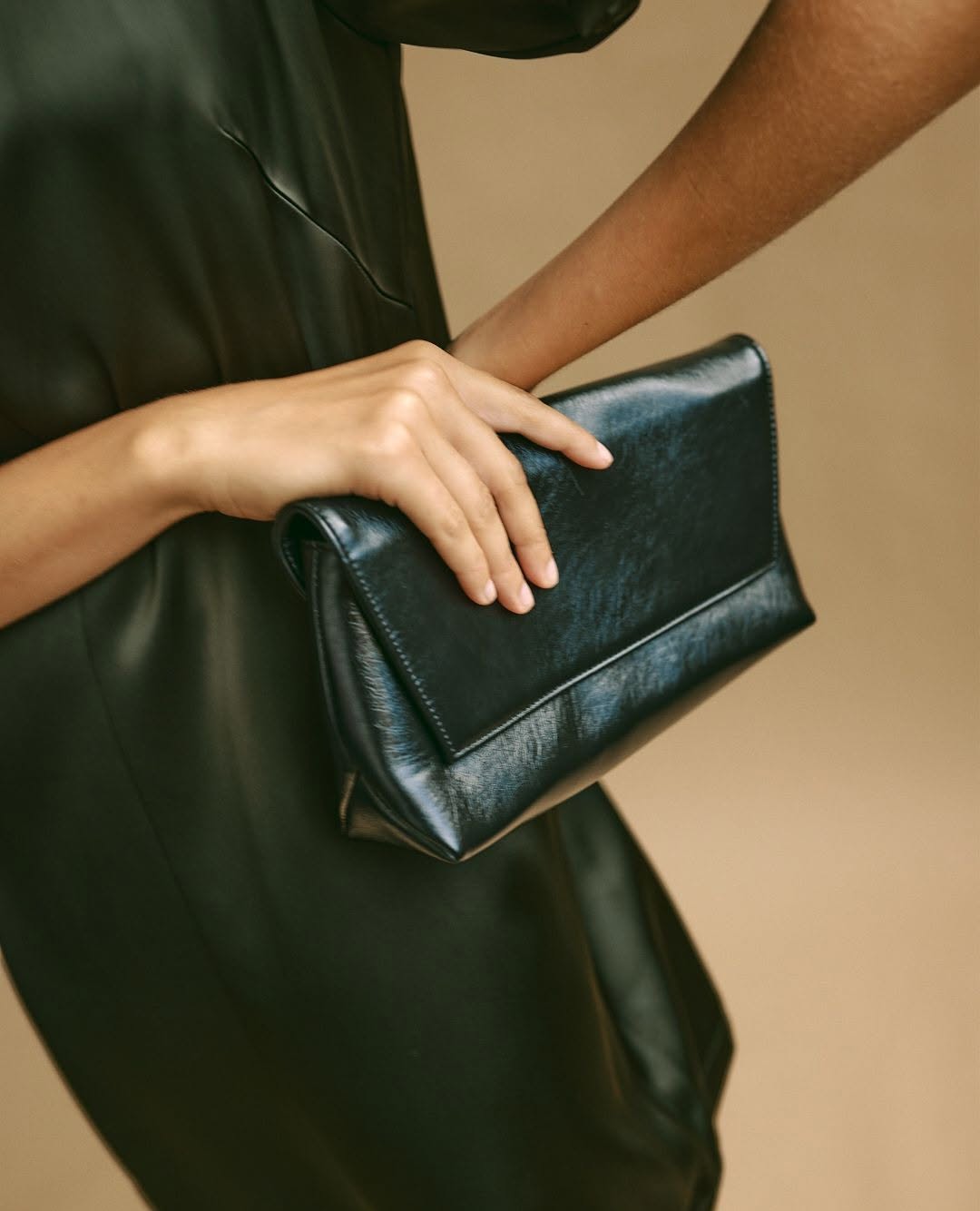 Design: A simple, flat envelope clutch design with no ruching, weaving, or pleats.