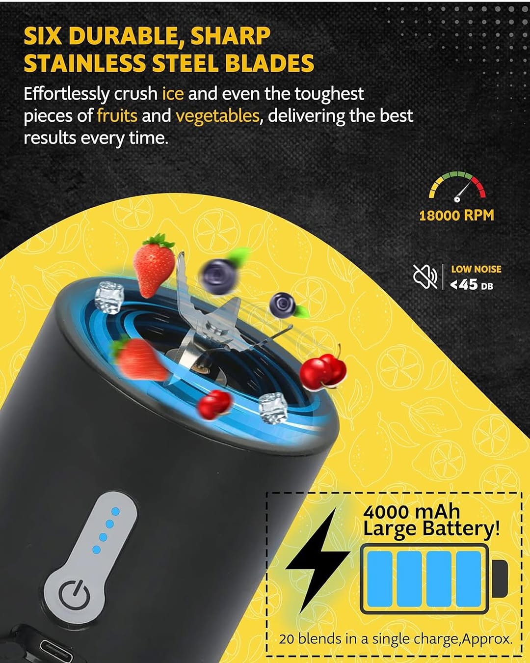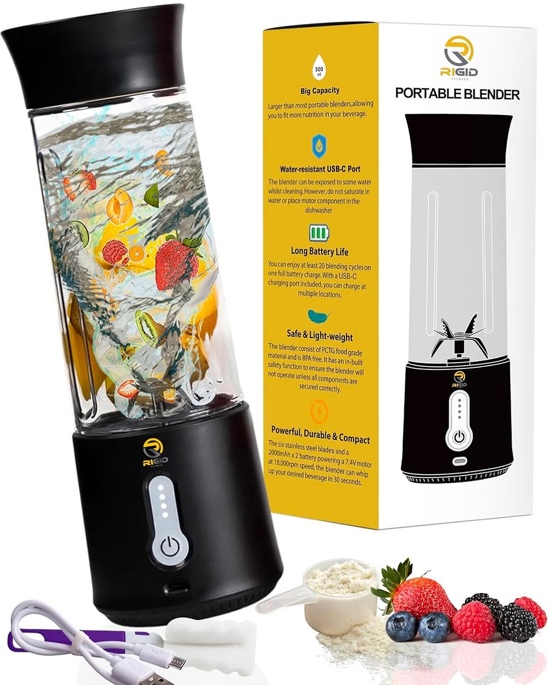 | Battery & Charging | 2000mAh Lithium-ion battery with a robust USB-C charging port. | Solves two key pain points: poor battery performance (only 1-2 uses) and faulty/fragile charging ports. A 2000mAh battery allows for 10-15 blends per charge, and USB-C is the modern, durable standard customers expect. |