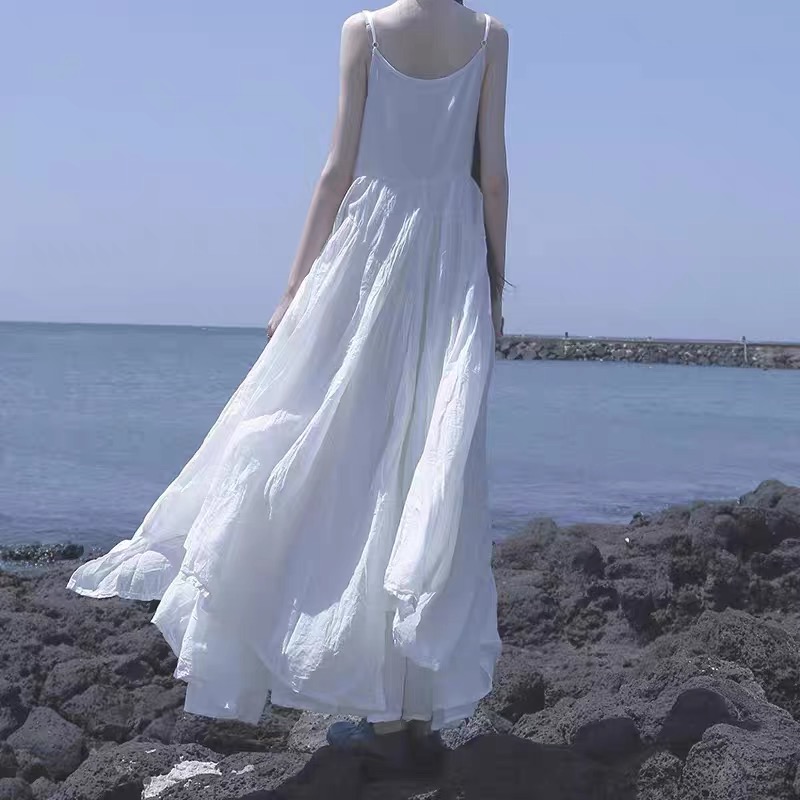 Pick up Leaks~Gentle Style Long Skirt for Women Summer Linen Tea Break French Style Tall and Slim Resort Style Suspender Beach Skirt