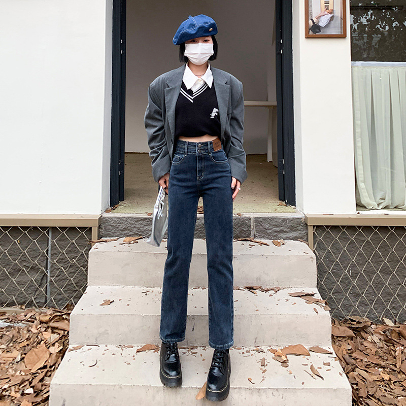 High-Waisted Cigarette Jeans for Women, Autumn and Winter 2025, Slim Fit, Petite, High-Stretch, Straight-Leg, Cropped Pants, Fleece-Lined for College Students