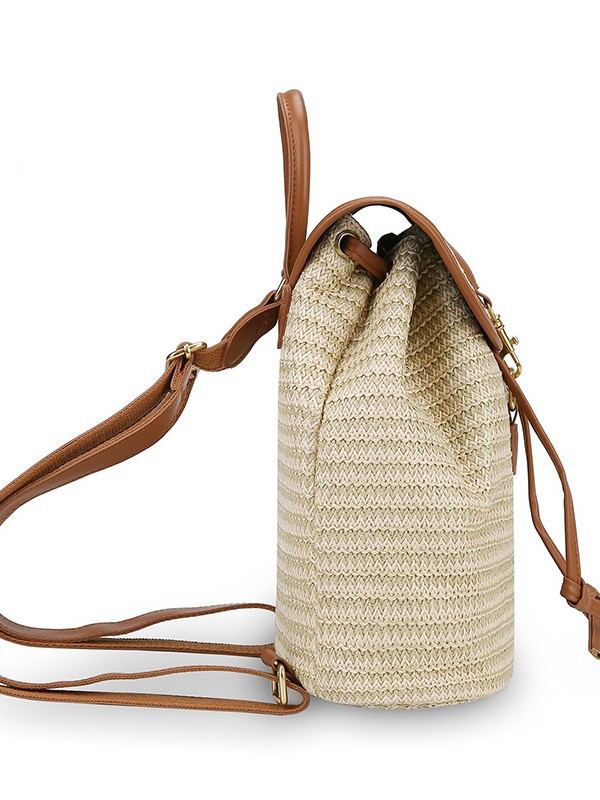 New Style Simple Splice Bag Cover Style Drawover Bucket Straw Bag Holiday Travel Women's Woven Backpack
