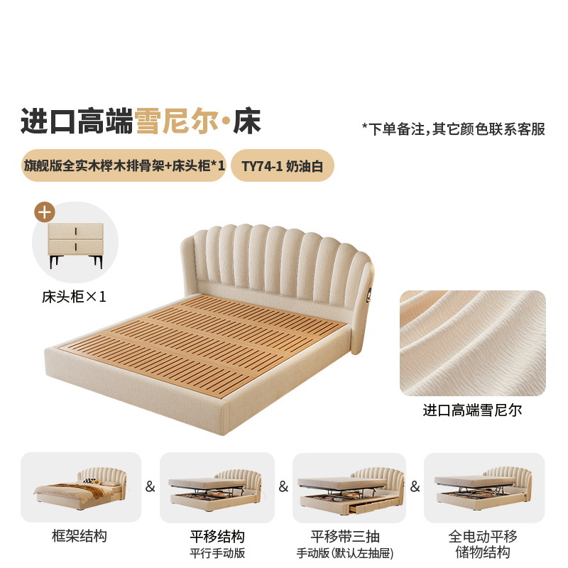Modern Minimalist Large Bed with Cream Style, Princess Bed for Master Bedroom, Double Bed for Small Apartments, Soft Cloud Petal Fabric Bed