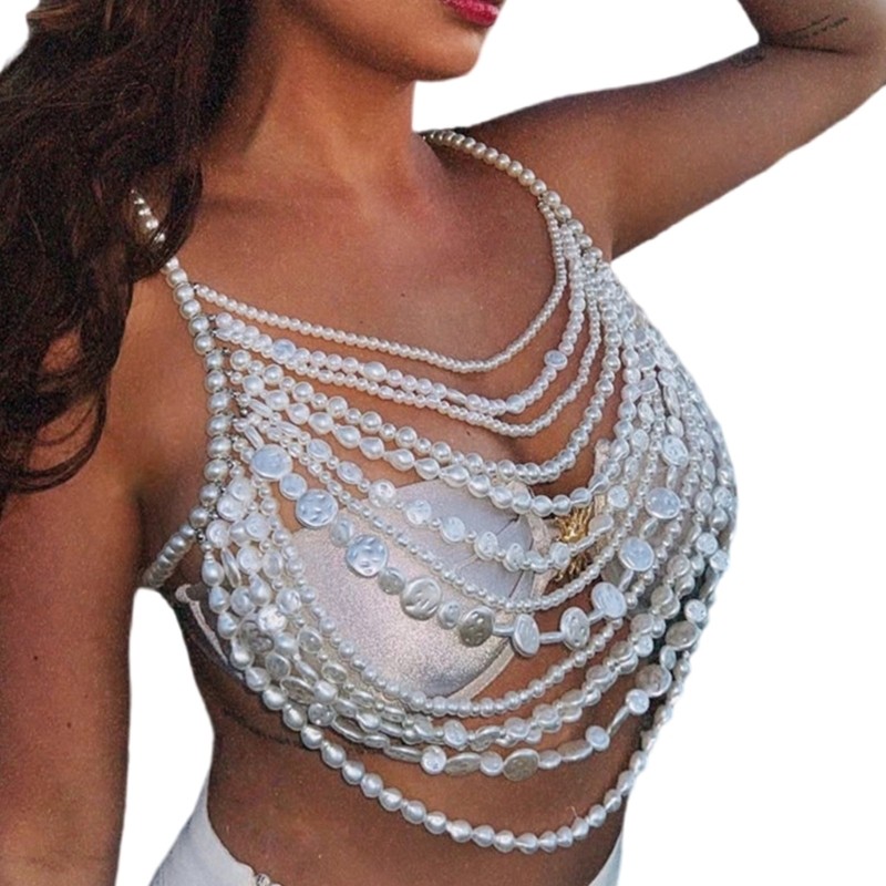 [Gorgeousxx] Corrente De Peito De Imitação De Pérola Da Moda Boêmia Para Mulheres , Acessórios De Joias Corporais Sexy