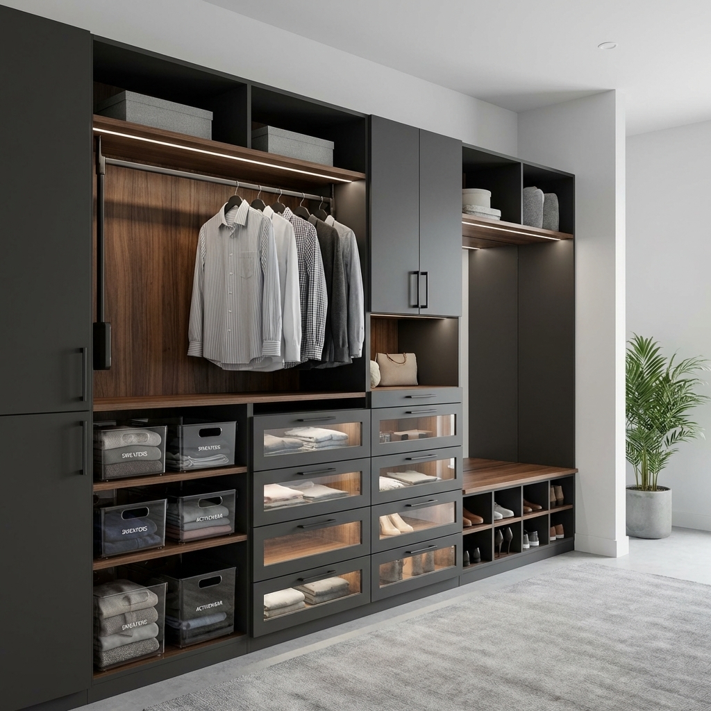 • Products include modular closet systems that can be reconfigured as needs change, and establishing functional "drop zones" at entryways to manage clutter.