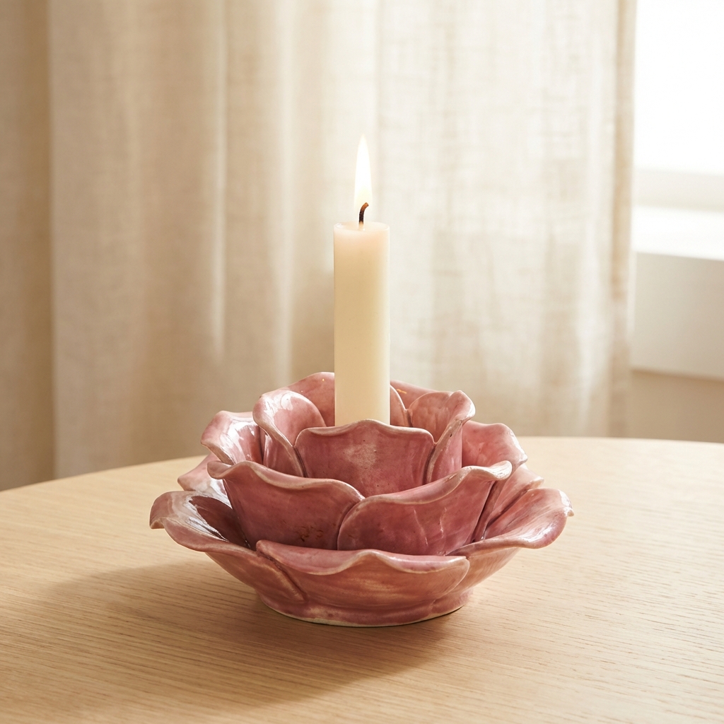 This theme highlights candle holders made from ceramic, often with unique, handcrafted details. Textures play a key role, with finishes ranging from glossy glazes to matte, sandblasted surfaces.