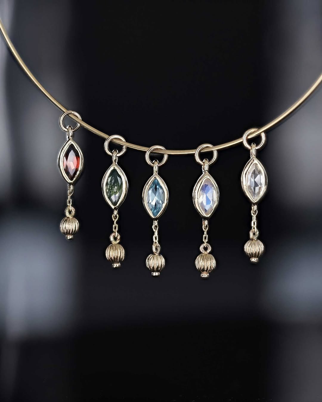 A best-selling handmade ring that allows for personalization with a cluster of natural gemstones like amethyst, peridot, topaz, and moonstone, often chosen as birthstones. The arrangement of the stones is organic and asymmetrical, resembling a natural formation of crystals, creating a meaningful, nature-inspired piece.