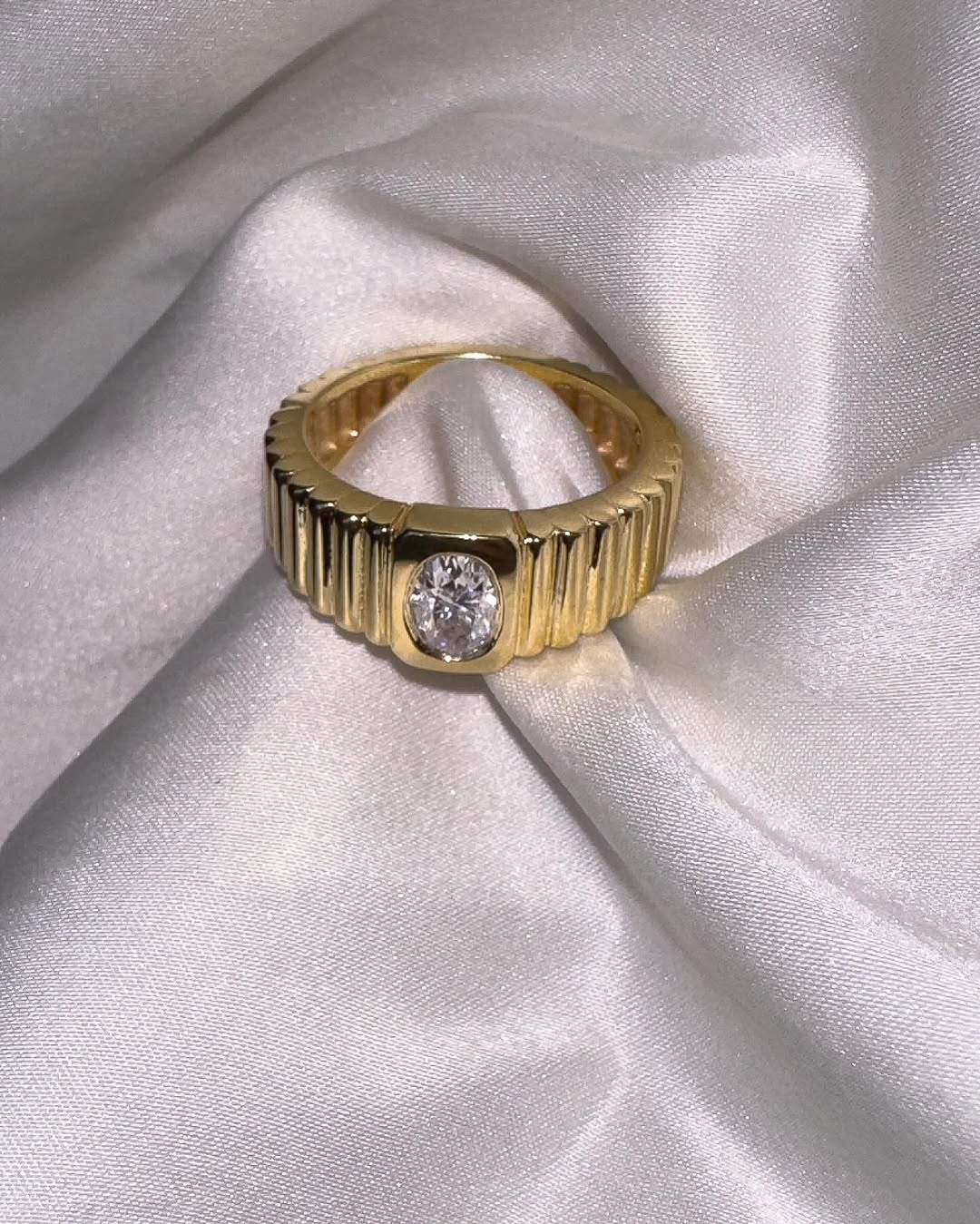 The Tiffany T T1 Wide Ring is a powerful and modern interpretation of the brand's iconic "T" motif, a design element present since the 1980s. This ring is characterized by its substantial weight and thickness, crafted in 18k yellow gold, appealing to those seeking a bold yet elegant statement. The clean, circular design with the angular 'T' creates a graphic and architectural look that embodies strength and independence. Its unmistakable shine and significant presence on the hand make it a top-of-mind choice for consumers embracing the chunky gold trend.