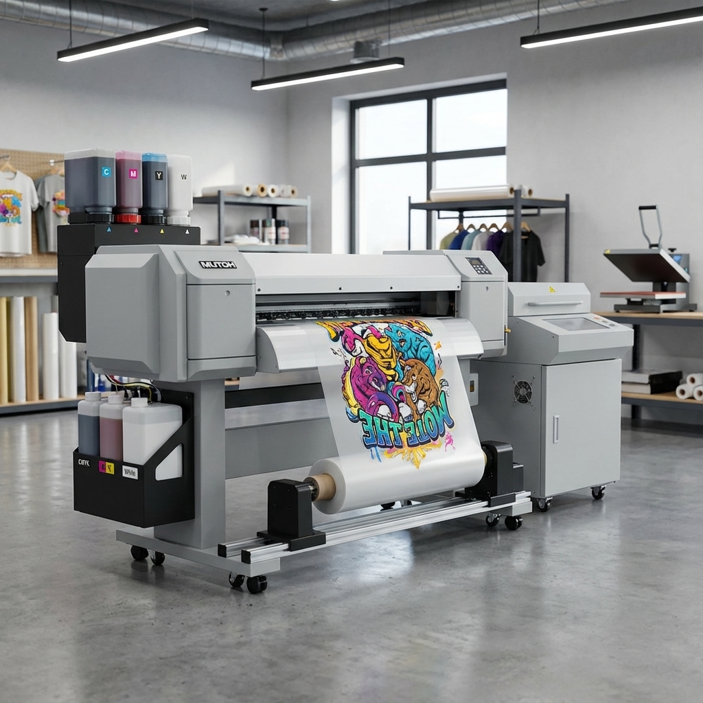 A specialized printing technology for creating transfers that can be heat-pressed onto various fabrics. Involves printing a design onto a special PET film, applying a powder adhesive, and then curing it.