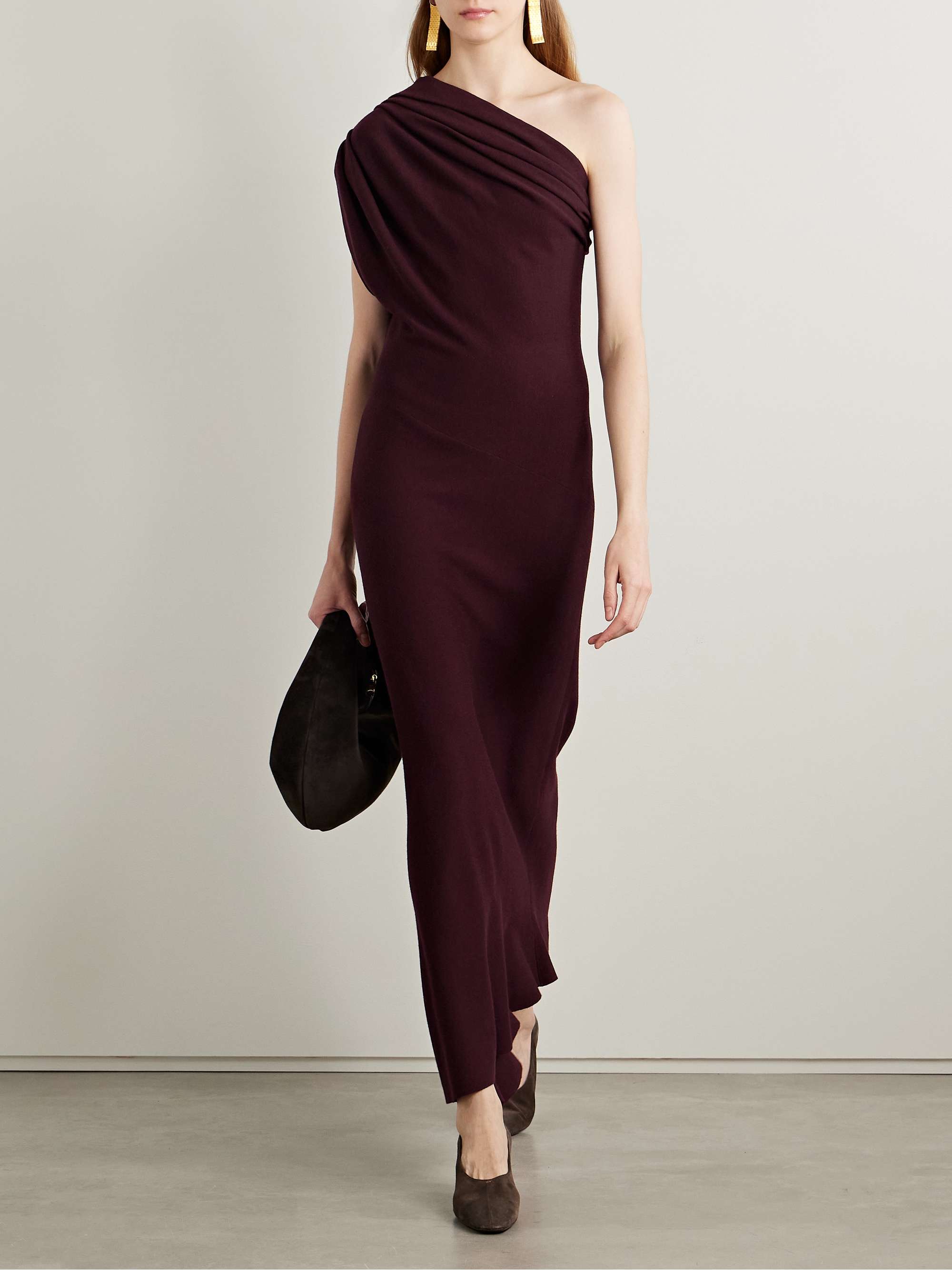 Khaite is a leading brand known for its modern yet timeless aesthetic, and the Coast Dress is a perfect embodiment of the draped and asymmetrical trend. This one-shoulder dress is crafted from a shimmery Lurex knit that is double-faced for a smooth feel against the skin. The design features a draped, one-shoulder neckline and an asymmetrical hem that creates a fluid and flowing skirt. The hand-pleated details at the neckline and armhole further highlight the brand's attention to craftsmanship, making this a subtle yet impactful interpretation of the trend.