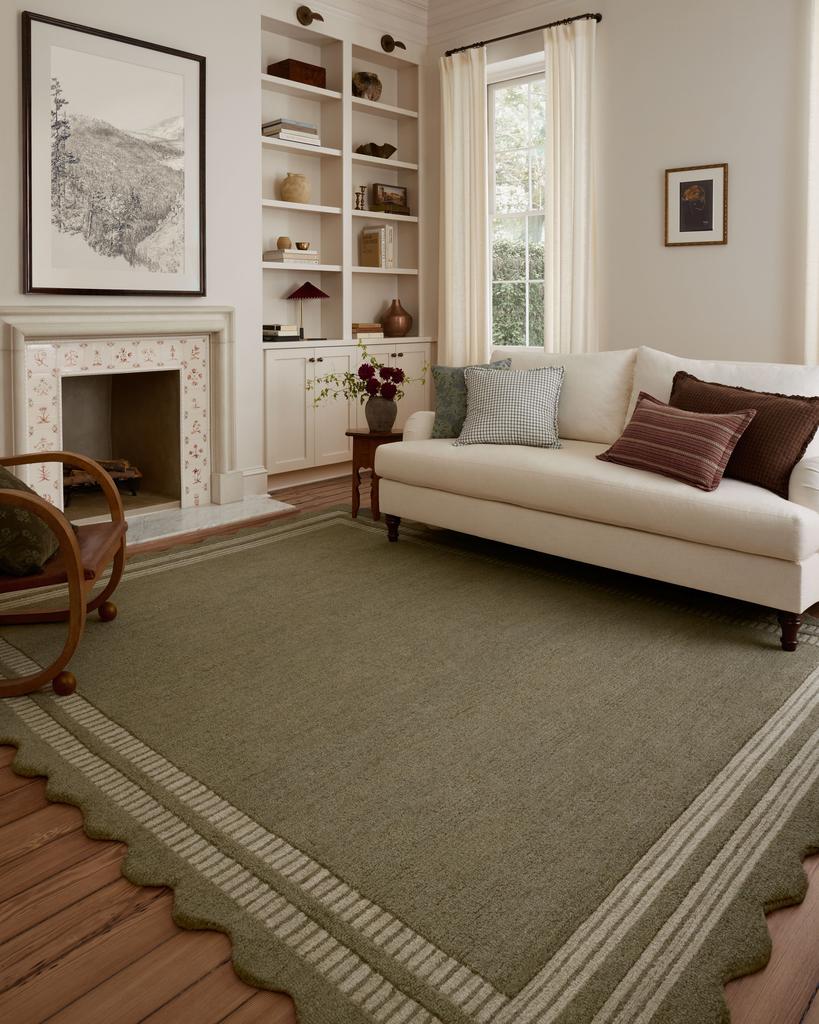 A result of the highly popular collaboration between design influencers Chris and Julia Marcum and the renowned manufacturer Loloi, the Scottie rug is a standout piece. It features a unique scalloped edge and a striped border that adds structure to its playful design. The rug's thick, plush pile is hand-tufted from 100% wool, offering a substantial and cozy feel underfoot. This collection is celebrated for its "easygoing earth tones and neutral colorways," making it a perfect anchor for a room that balances personality with a grounded, natural aesthetic. The design is GoodWeave-certified, ensuring a commitment to ethical production.