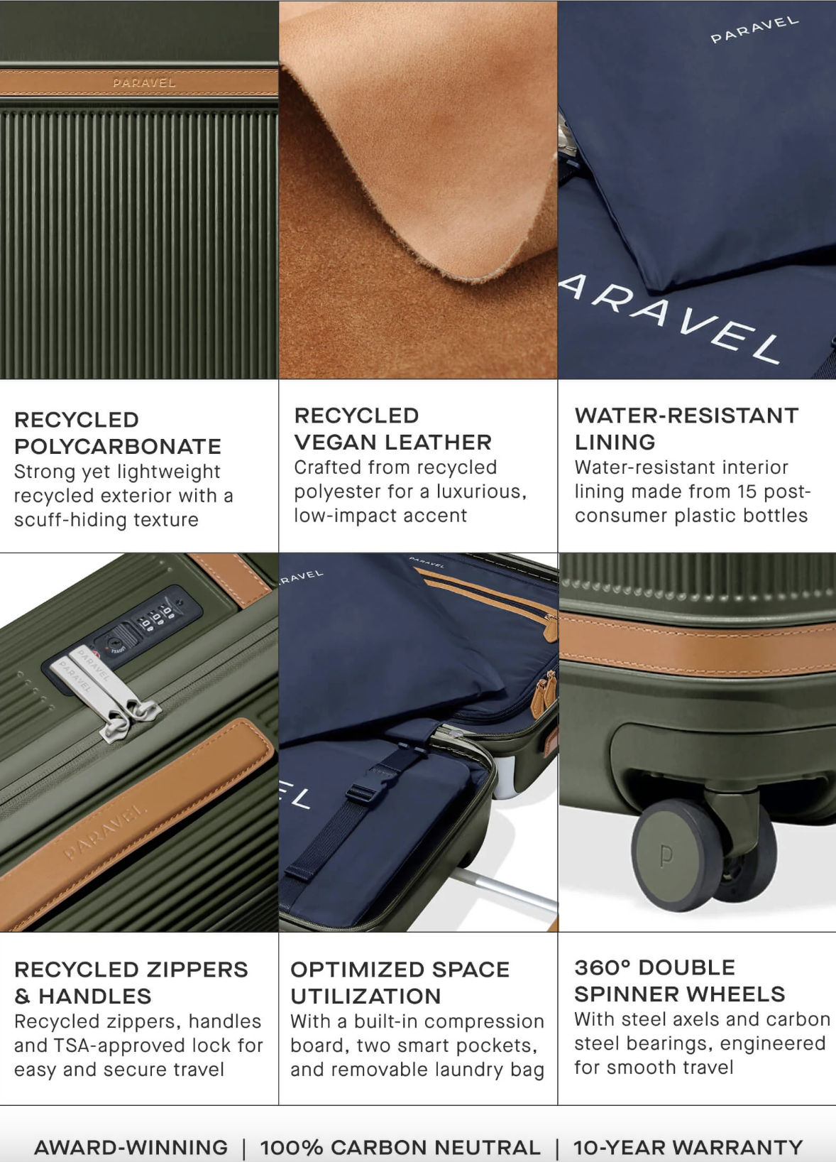 Paravel has established itself as a leader in stylish, sustainable travel goods, often described as the "poster child" for environmentally friendly luggage. The Aviator Carry-On is the brand's signature product and the world's first carbon-neutral suitcase. It showcases a deep commitment to eco-conscious design through its use of recycled materials, including a recycled polycarbonate shell, recycled aluminum handle, and vegan leather details derived from post-consumer plastic bottles. The brand also offsets all carbon emissions from manufacturing and shipping. While not featuring electronic "smart" components, its intelligent, durable, and lightweight design is recognized by trend-aware consumers as a smart choice for the planet without sacrificing luxury aesthetics.