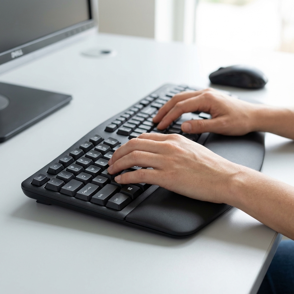 The Logitech ERGO K860 is a wireless split keyboard designed to improve typing posture. Its curved, split keyframe reduces muscle strain on your wrists and forearms. The keyboard's sloping design and cushioned palm rest offer 54% more wrist support and reduce wrist bending by 25% compared to standard keyboards. The Perfect Stroke keys are shaped for fingertip precision, ensuring a fluid and quiet typing experience. This model is praised for its ability to allow users to type for extended periods without fatigue and features an adjustable palm lift to maintain a natural posture whether sitting or standing.