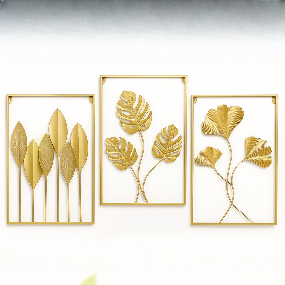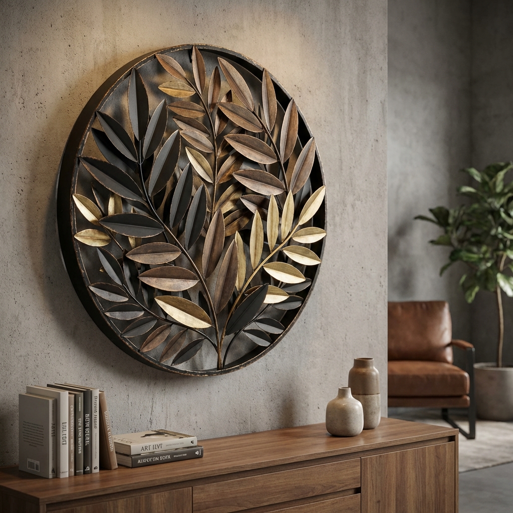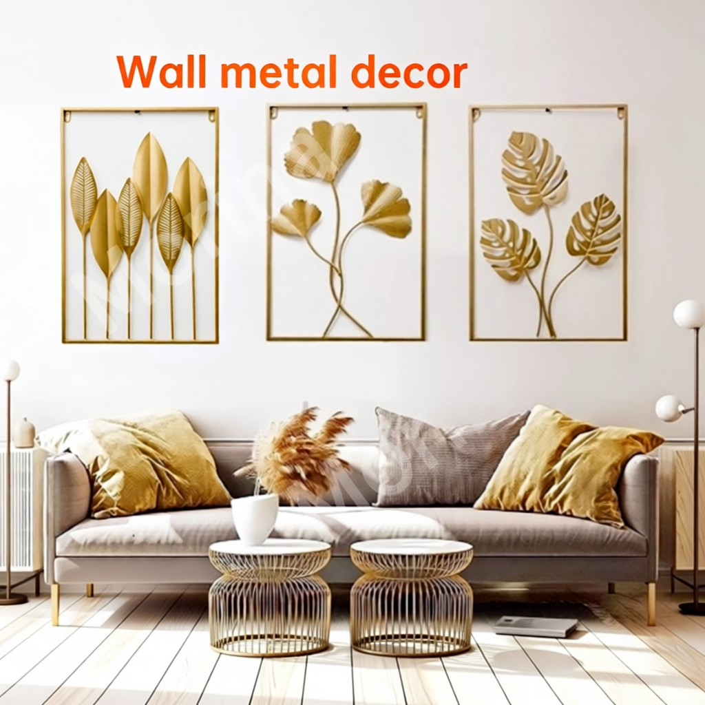 This theme features wall decor made from metals like steel, often with a black, gold, or chrome finish. Designs include geometric shapes, abstract figures, and nature-inspired motifs like leaves.