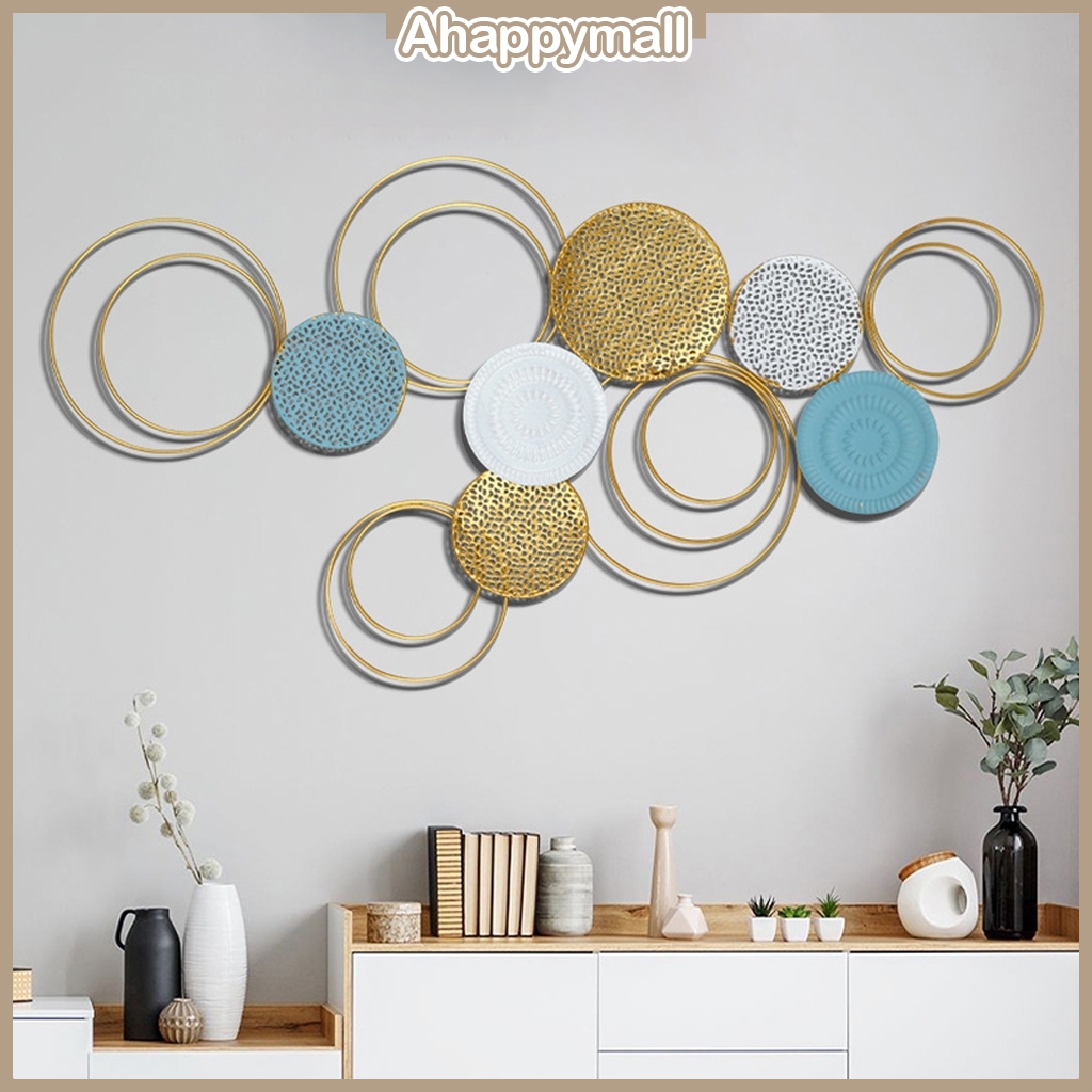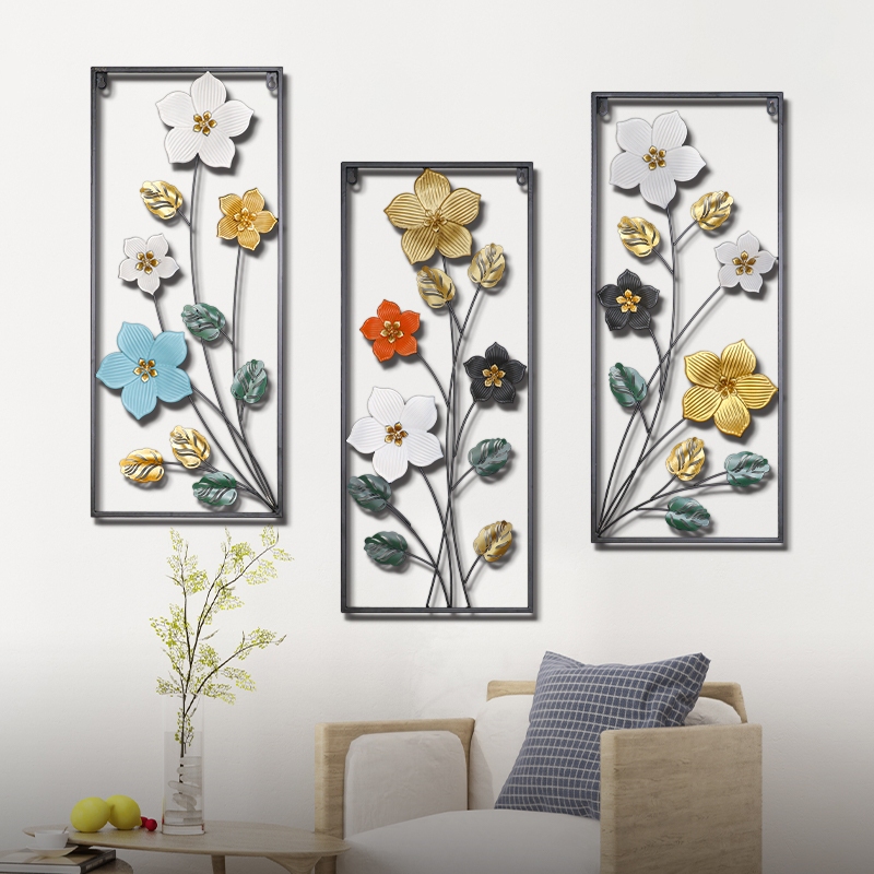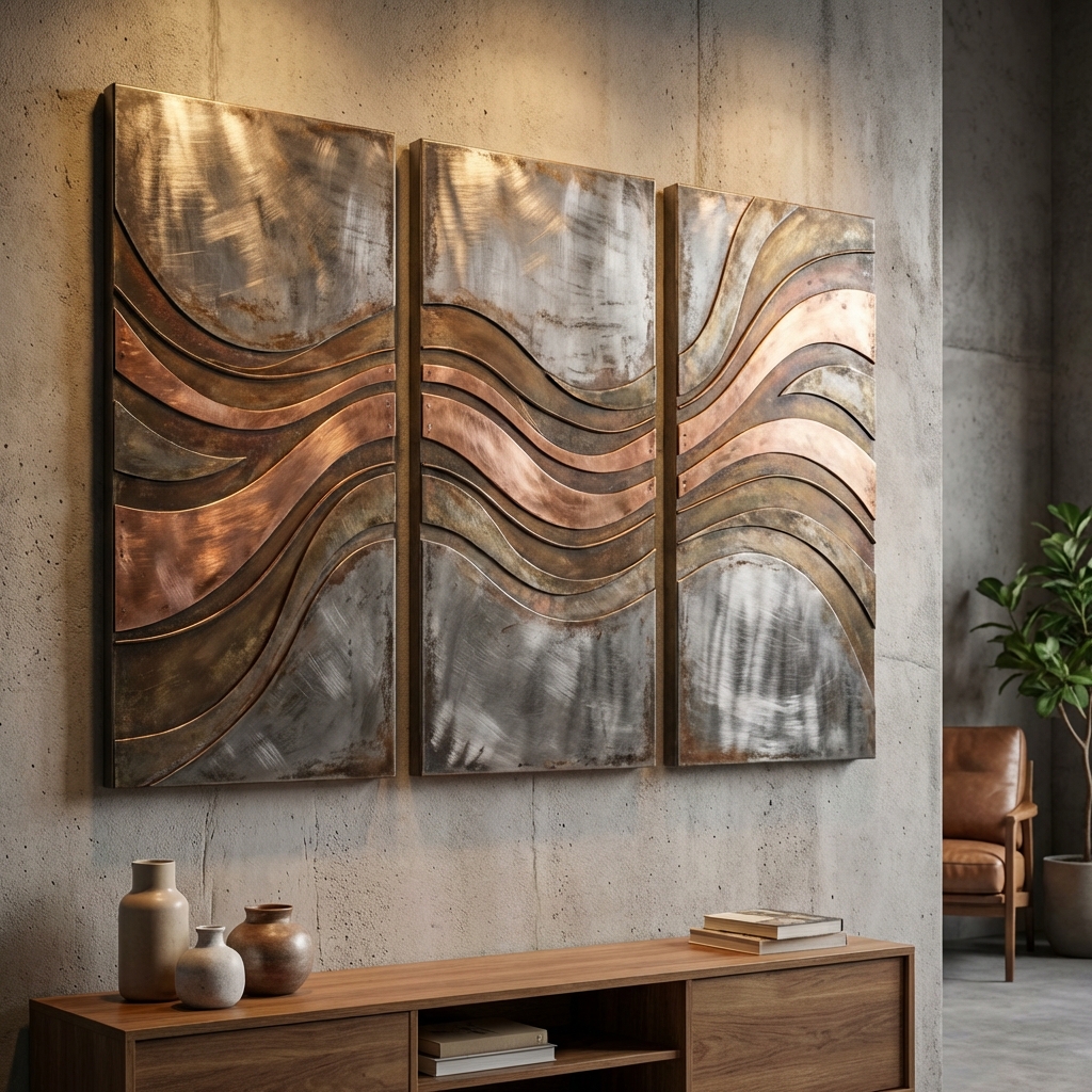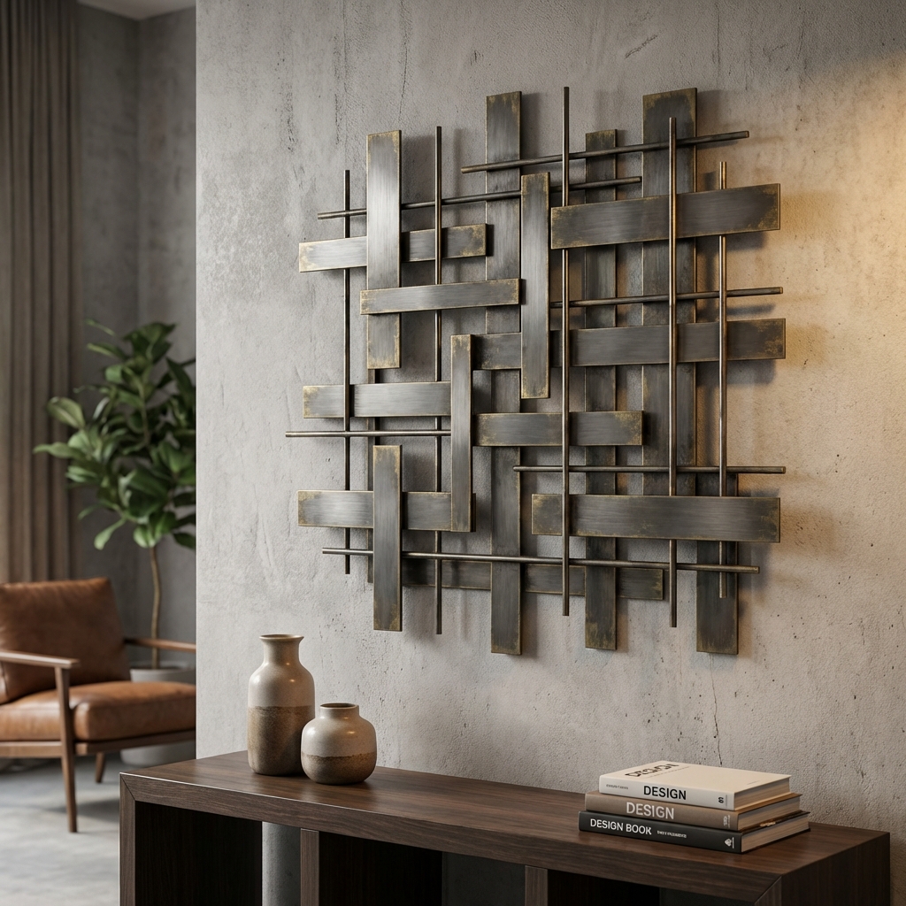 This theme features wall decor made from metals like steel, often with a black, gold, or chrome finish. Designs include geometric shapes, abstract figures, and nature-inspired motifs like leaves.