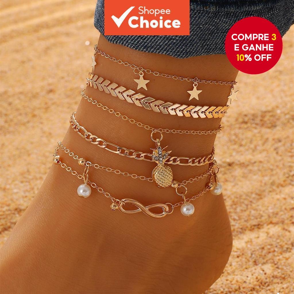 A pairing of two distinct anklets for a layered and mixed-metals look. The "Tornozeleira Luar banhada à Ouro" offers a warm, golden glow with celestial charms. This is layered with the "Tornozeleira de prata 925 v12 com bolinhas," a delicate silver chain with beaded details. The combination mixes metals, textures, and motifs for a balanced and stylish look.
