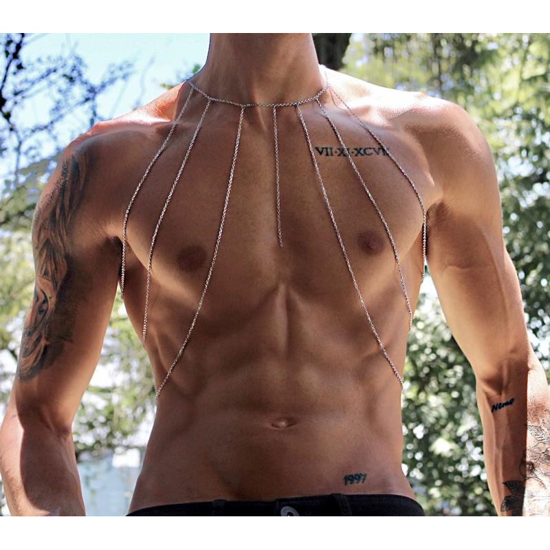 The Bodychain Vertige is a piece that exudes attitude and sensuality. Crafted from metal plates and adjusted with chains, it features a striking vertical design with circular details that drape down the torso. This handmade piece is adjustable, allowing it to complement a variety of body types and outfits. It is a classic example of Eleonora Hsiung's conceptual and creative approach to jewelry, transforming a simple chain into a powerful statement of personal style and encapsulating the maximalist trend by adorning a large portion of the body.