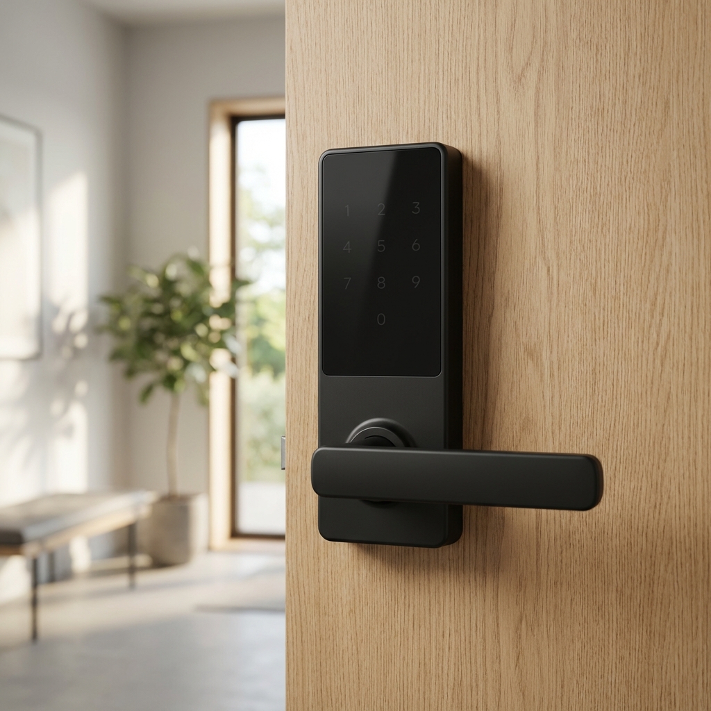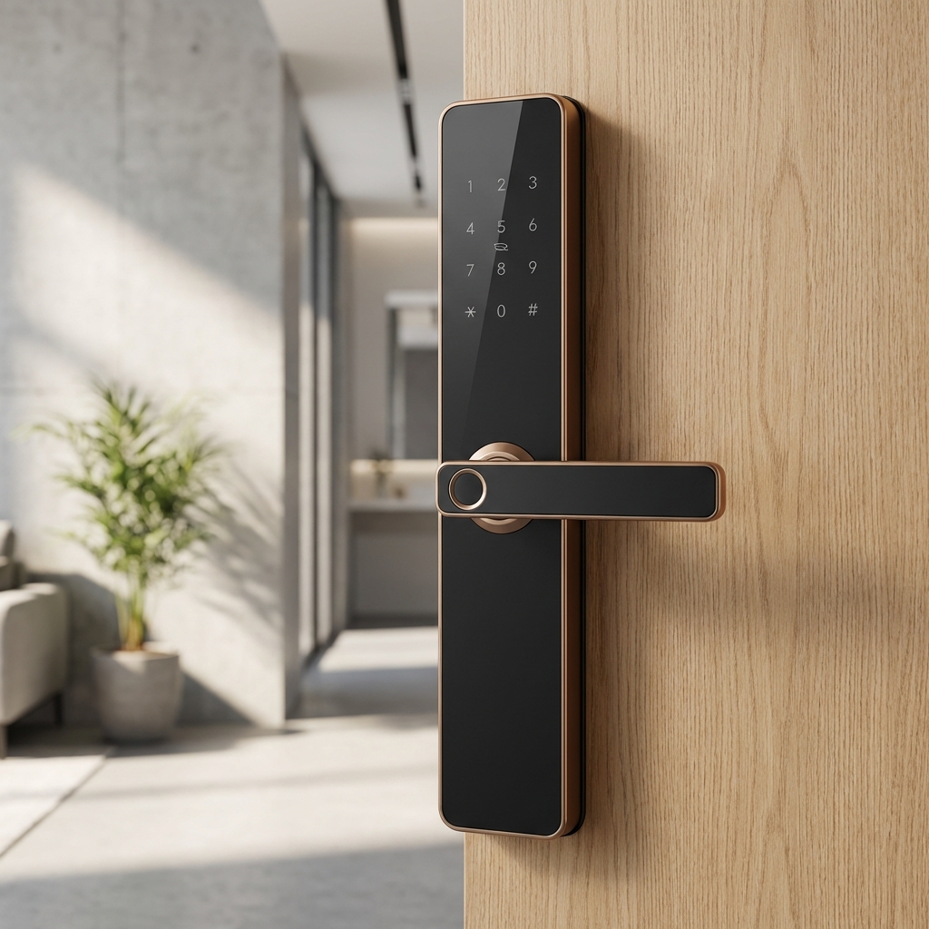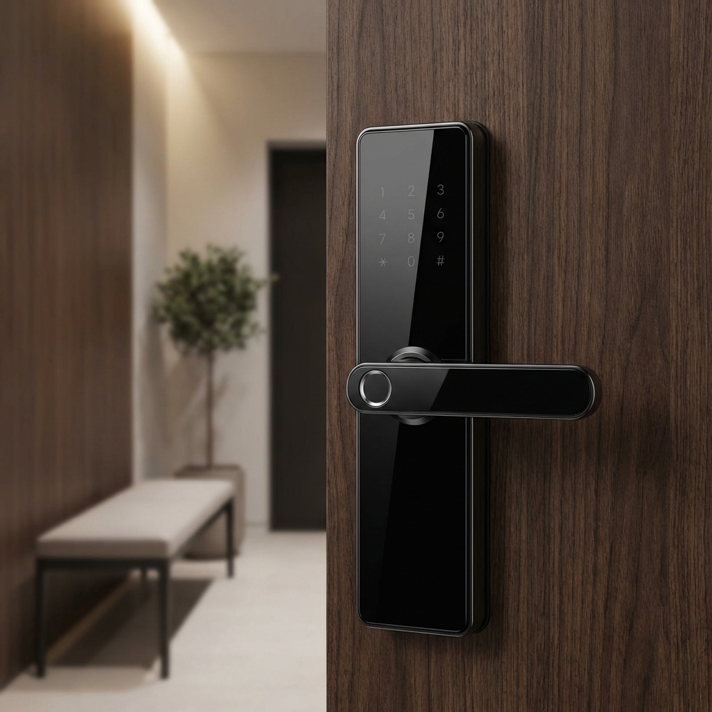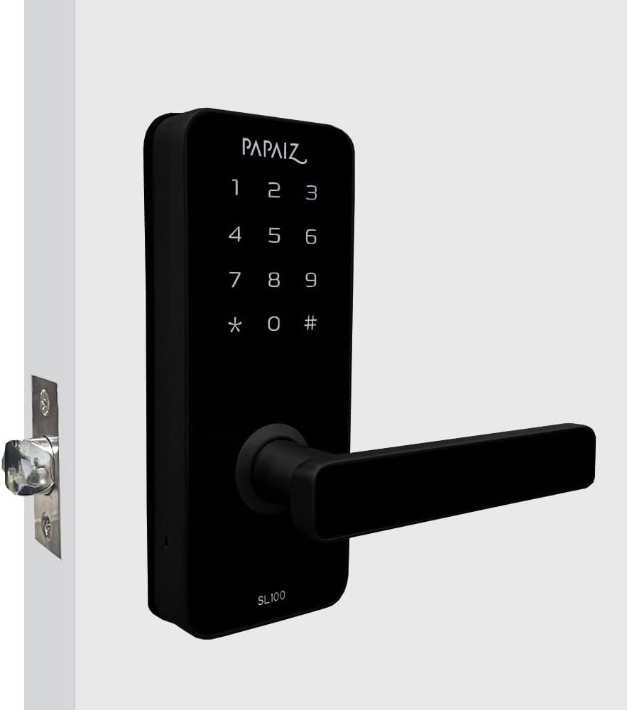 The Papaiz Smart Lock SL100 stands out with its exclusive and elegant design, offered in black or silver finishes to complement various modern door styles. This model features a touch-sensitive keypad on a sleek, vertical body with a well-integrated and ergonomic handle. The design is clean and contemporary, avoiding any harsh lines or bulky components. The smooth surface and the seamless integration of the keypad and handle create a sophisticated and uncluttered look that is highly sought after in modern design. The Papaiz SL100 helps to advance this trend by demonstrating that a full-featured lock with a handle can still achieve a minimalist and elegant profile. It provides access via password and proximity card, along with a traditional key for emergencies, combining Papaiz's legacy in security with a clear focus on modern aesthetics.