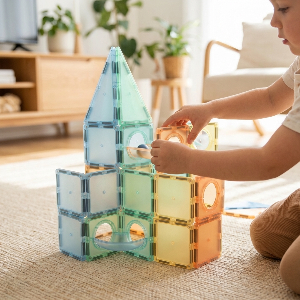 These toys are designed as systems that can be built, rebuilt, and expanded upon. They include products like magnetic building tiles, modular construction sets, and figures with interchangeable parts.