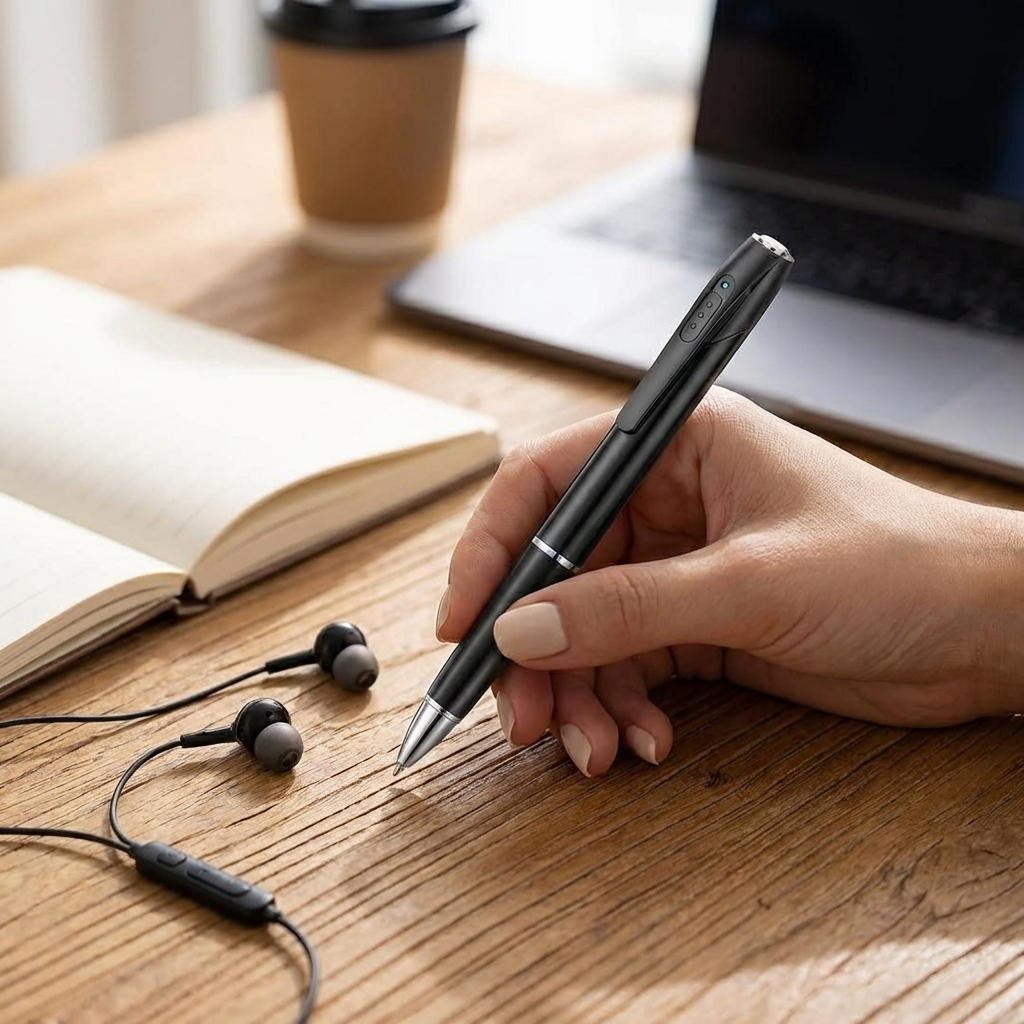 A functional ballpoint pen that discreetly houses a voice recorder and an MP3 player. It supports a memory card for storing audio files and music, and comes with earphones and a USB cable. This combination offers a seamless blend of analog utility and digital entertainment, appealing to consumers who prioritize convenience and discretion.