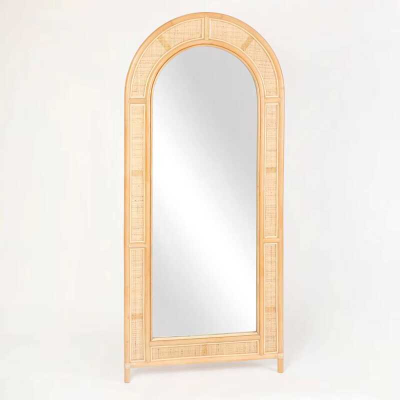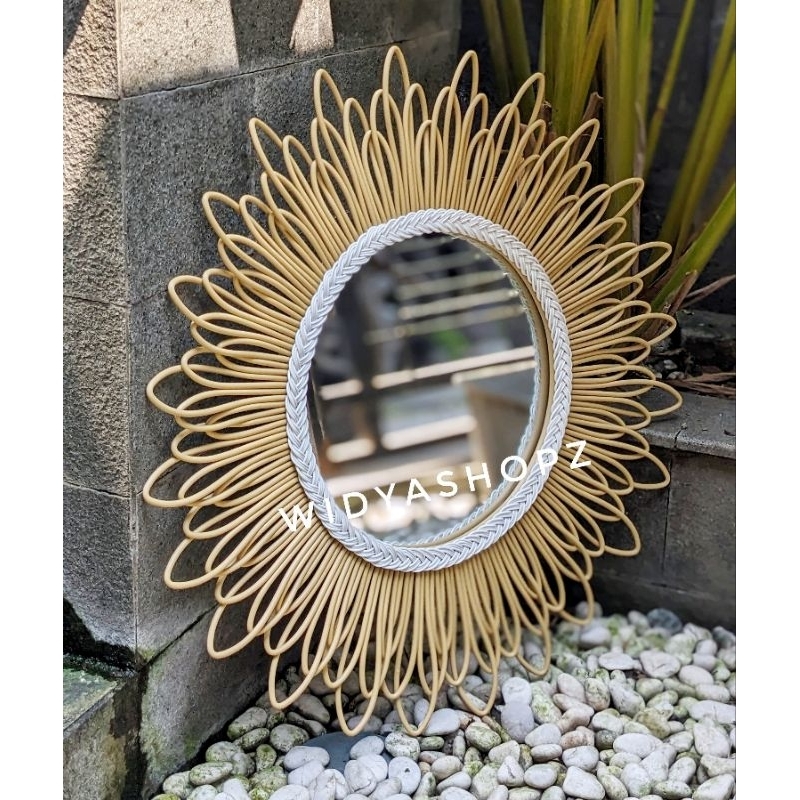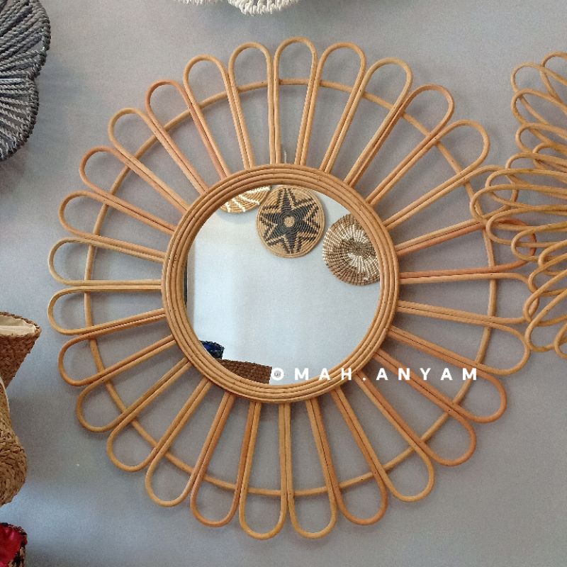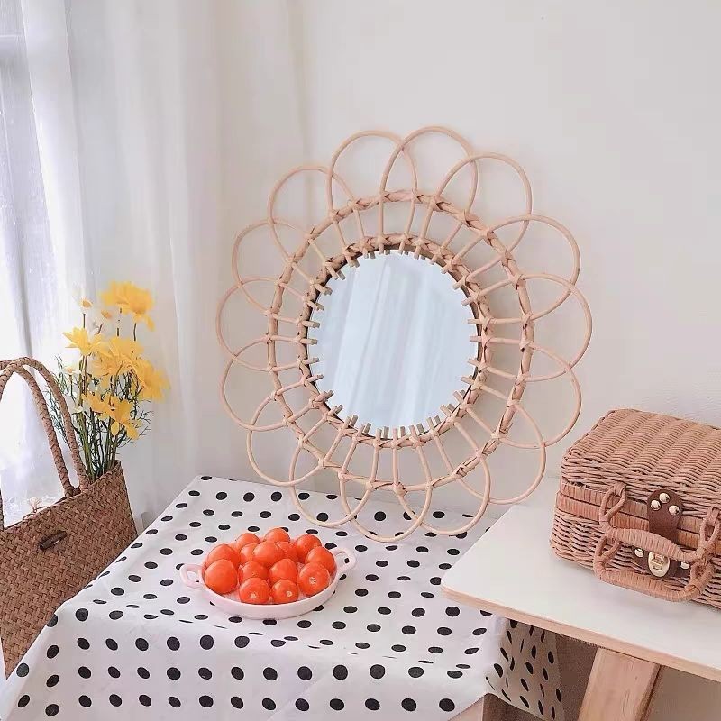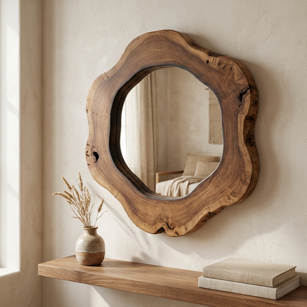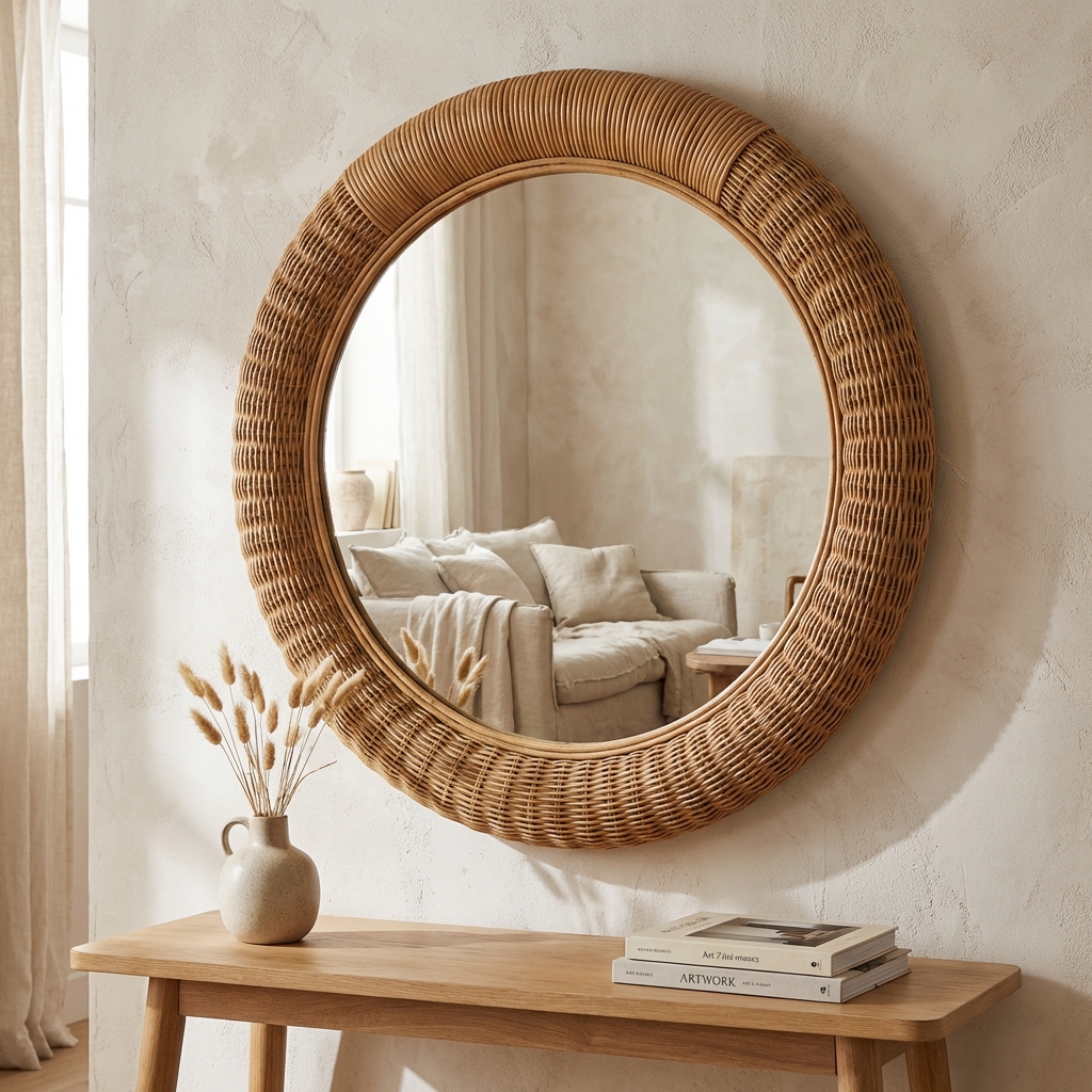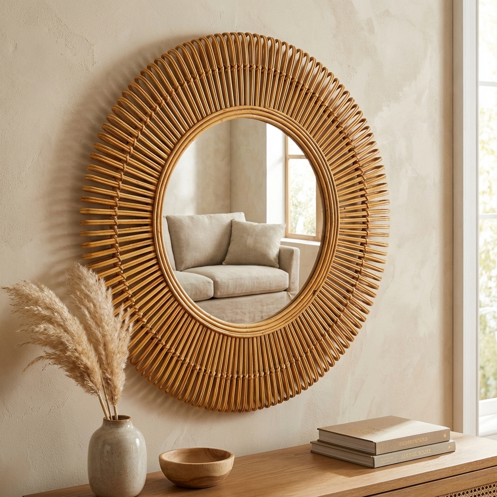 This theme embraces the use of organic, tactile materials for mirror frames, bringing warmth and texture into the home. Rattan is a very popular material, used in bohemian and tropical-inspired designs, including sunburst and floral shapes.