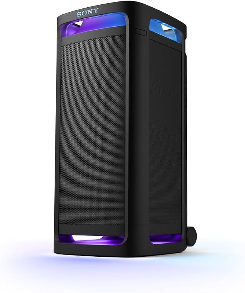 As Sony's biggest and most powerful party speaker with a built-in battery, the ULT TOWER 9 is designed to deliver massive sound anywhere. It stands over 43 inches tall and features a 12.6-inch woofer, two tweeters, and two mid-range drivers for powerful, deep bass and clear audio. A signature feature is the "ULT" button, which provides a significant bass boost. The speaker also includes a 10-band graphic EQ, DJ effects, and inputs for a microphone or guitar for karaoke. The ULT TOWER 9 embodies the "Party Power Speaker" theme by combining immense power, room-filling omnidirectional sound, and an ambient light show to create a concert-like experience.