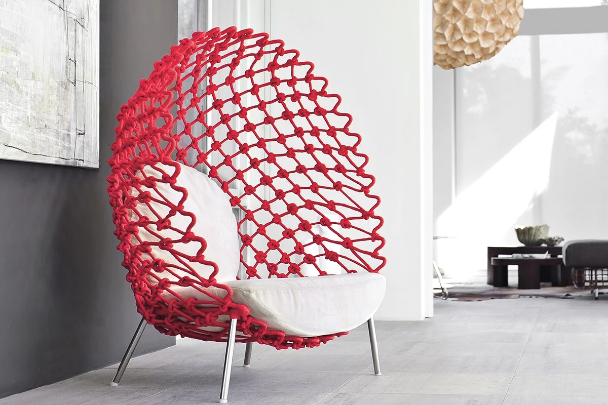 An icon of Filipino design, the Dragnet Lounge Chair is inspired by the "bubo," a traditional Filipino fish trap. Its wide, enveloping shape is created by a single continuous line of fabric or rattan woven over a steel frame, creating a cocoon-like feel. This intricate weaving technique gives the chair a lightweight, airy appearance while providing a comfortable and supportive seat. It is a prime example of functional art, mixing elegance and simplicity.