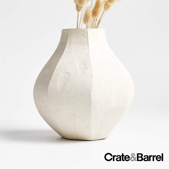 Designed by renowned designer Athena Calderone for Crate & Barrel, the Facette White Vase is a prime example of sculptural minimalism. Its multifaceted surface, inspired by hand-troweled plaster finishes, gives it a unique texture that is imperfect to the core. This quality allows the vase to stand alone as a decorative object or to hold dried botanicals. The design gives this ancient form a sleek, modern look. The well-weighted vase is versatile and can be displayed on an entryway table or as a centerpiece on a coffee table.