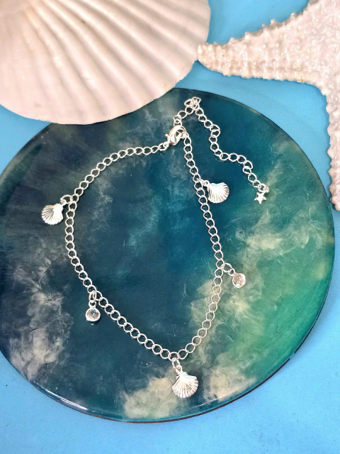 Key Product: Tornozeleira de prata mar com concha, cavalo marinho e estrela do mar