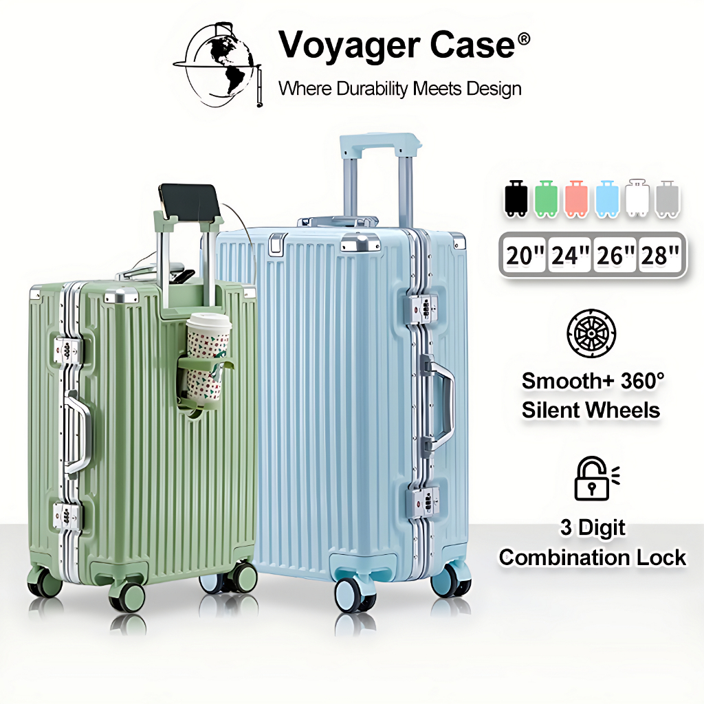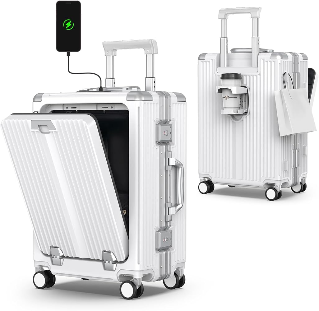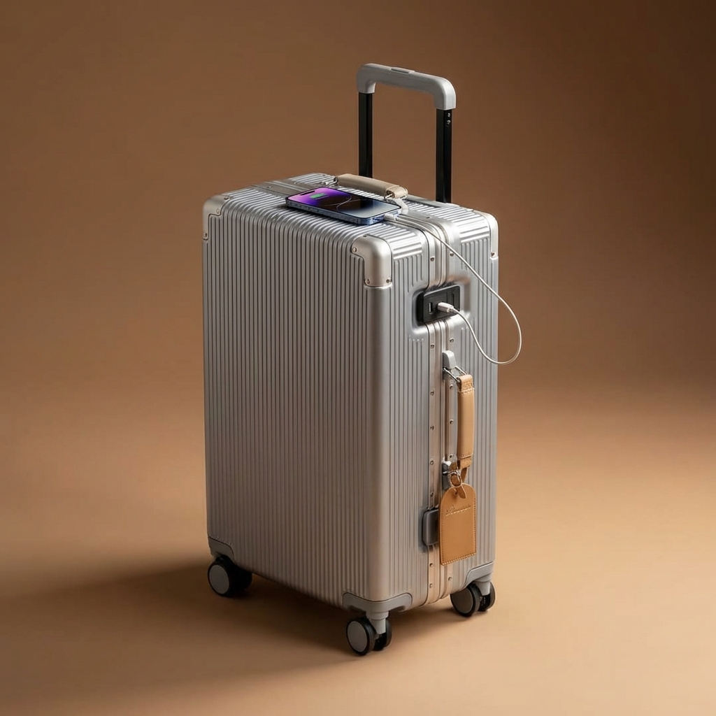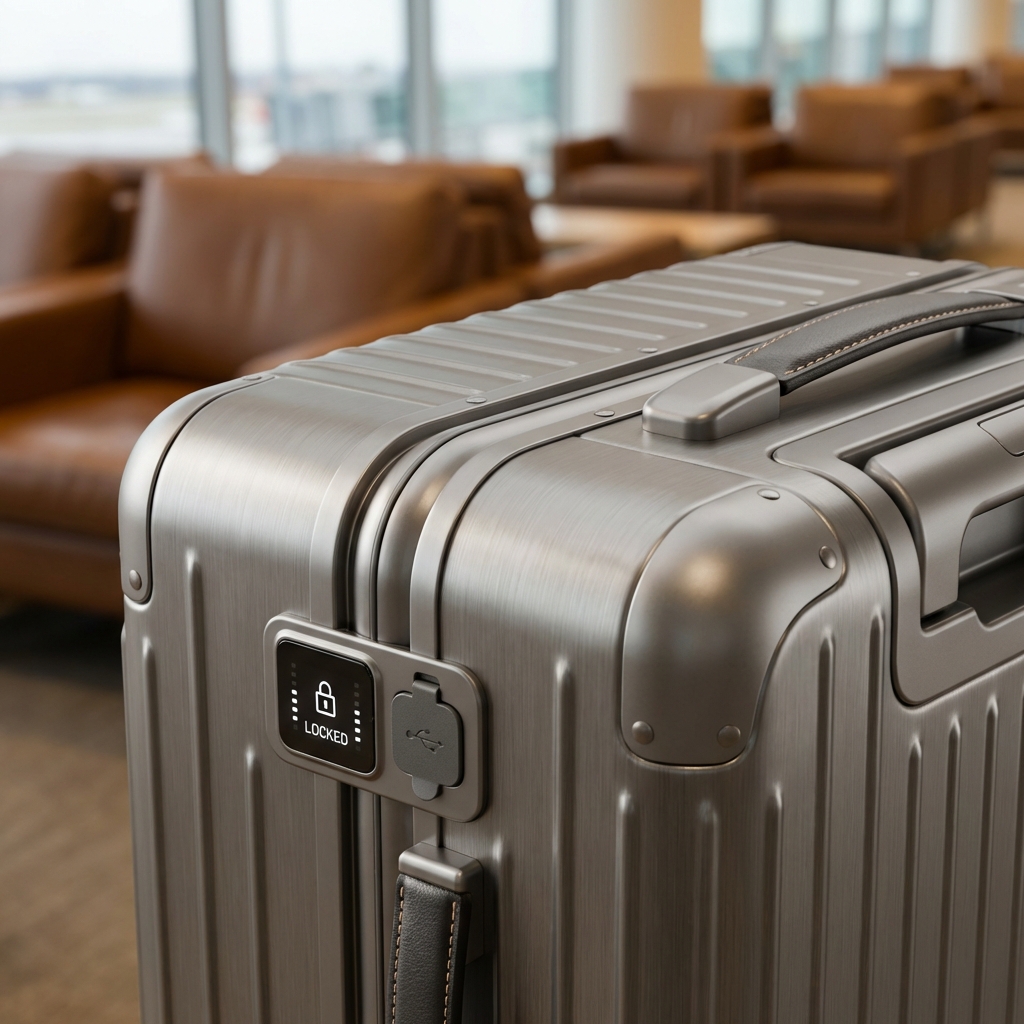 This theme centers on aluminum luggage integrated with technological features for the modern, connected traveler. Key characteristics include built-in USB charging ports for powering devices on the go.