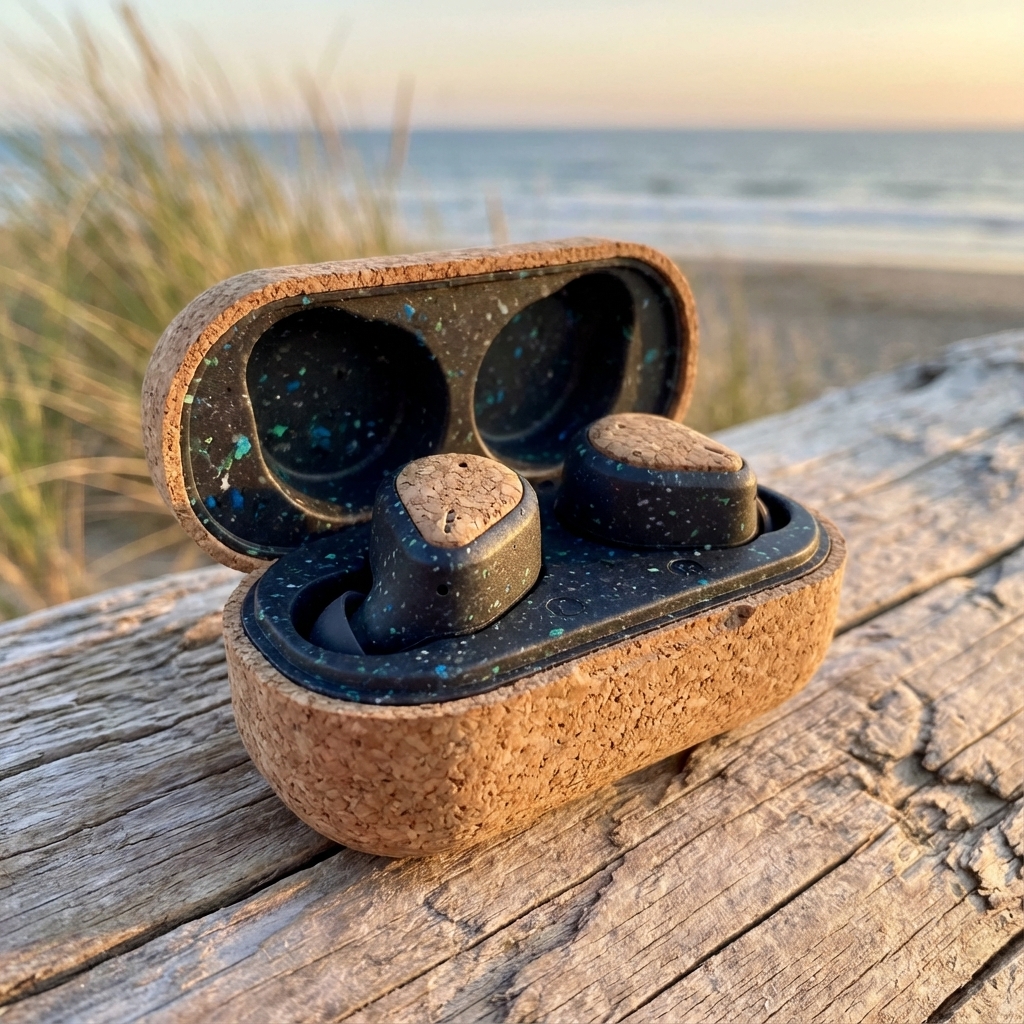 Constructed from biodegradable and recycled plastics, these earbuds feature 13mm bio-cellulose speaker drivers made from certified compostable plastic. They offer Bluetooth 5.3, low latency for gaming, and an IPX7 waterproof rating. The brand is committed to environmental responsibility through initiatives like the Majority Forest.