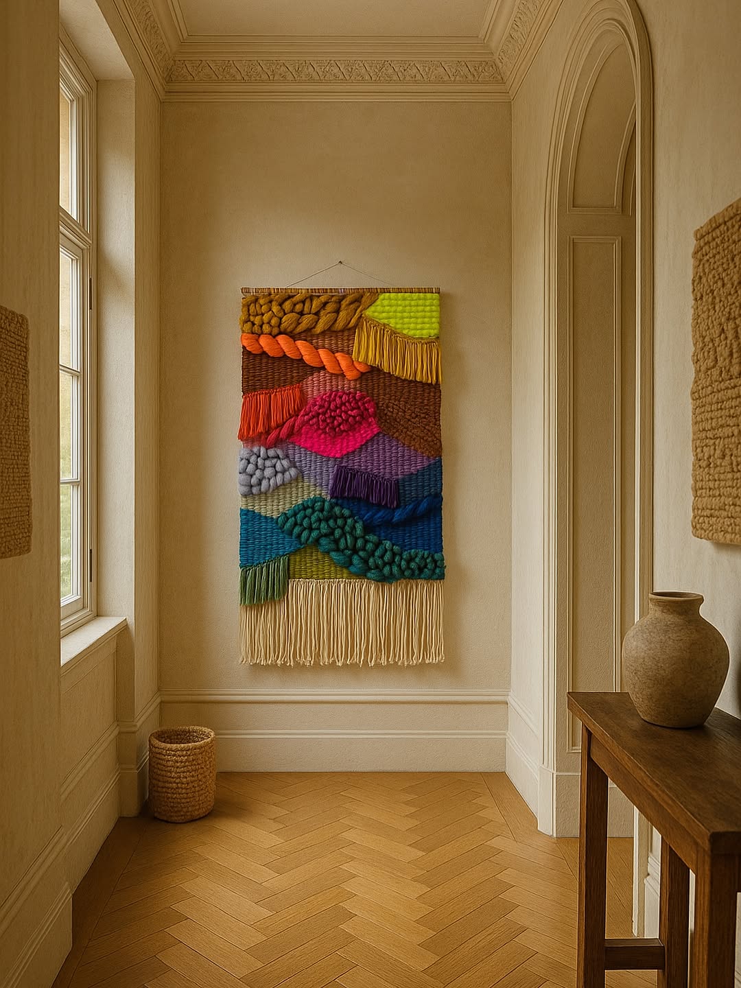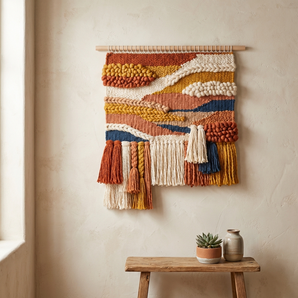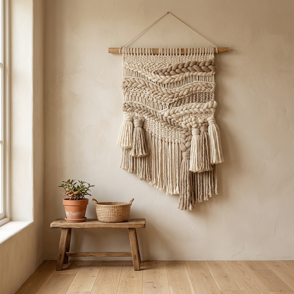 This theme includes handmade woven wall hangings, such as macrame and pieces made from local fibers like abaca and rattan. The art is characterized by its intricate knots, asymmetrical patterns, and rich textural quality.