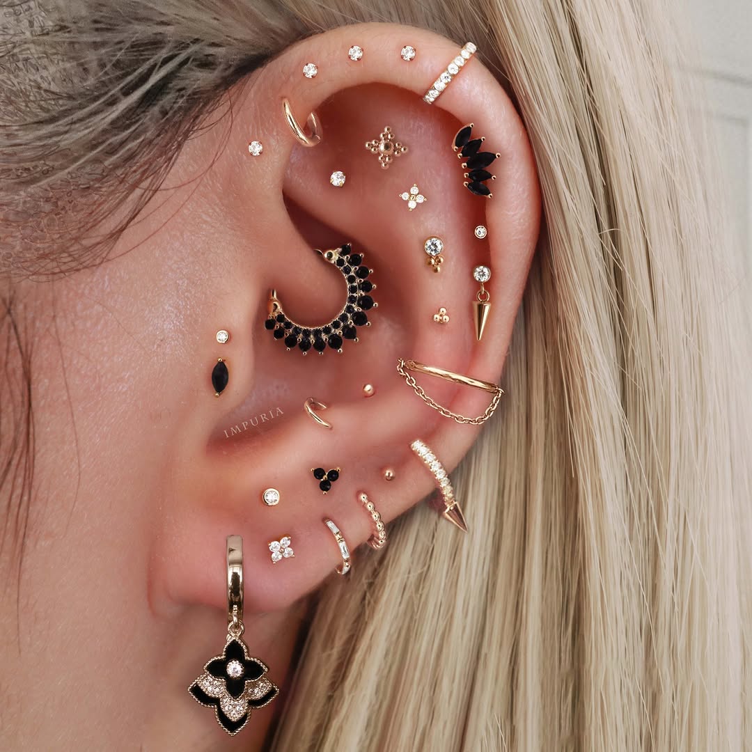 Body Vision Los Angeles (BVLA) is a leader in high-end, handcrafted body jewelry, revered for its exceptional quality and intricate designs in solid gold with ethically sourced gemstones. The Mini Kandy is an iconic and versatile piece featuring a central gemstone surrounded by clusters of tiny gold beads, resembling a starburst. This design is perfect for adding a point of interest to various cartilage piercings like the helix, conch, or tragus, serving as a centerpiece or an accent in a larger ear project.