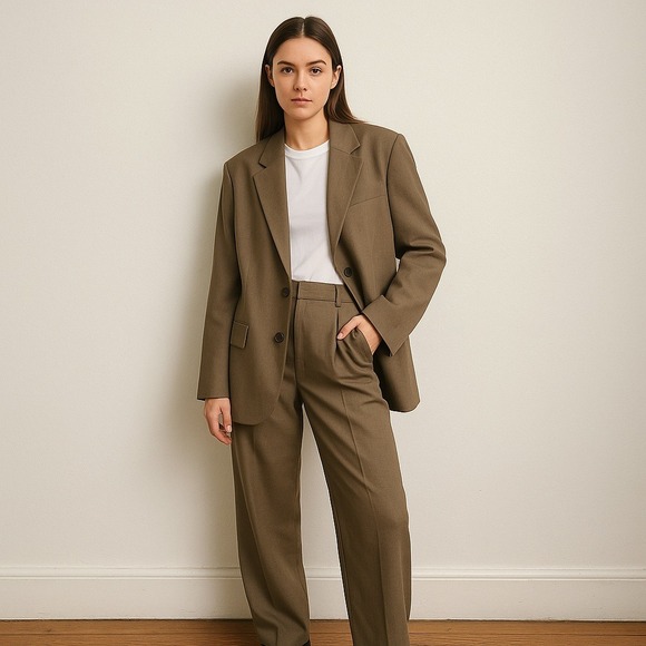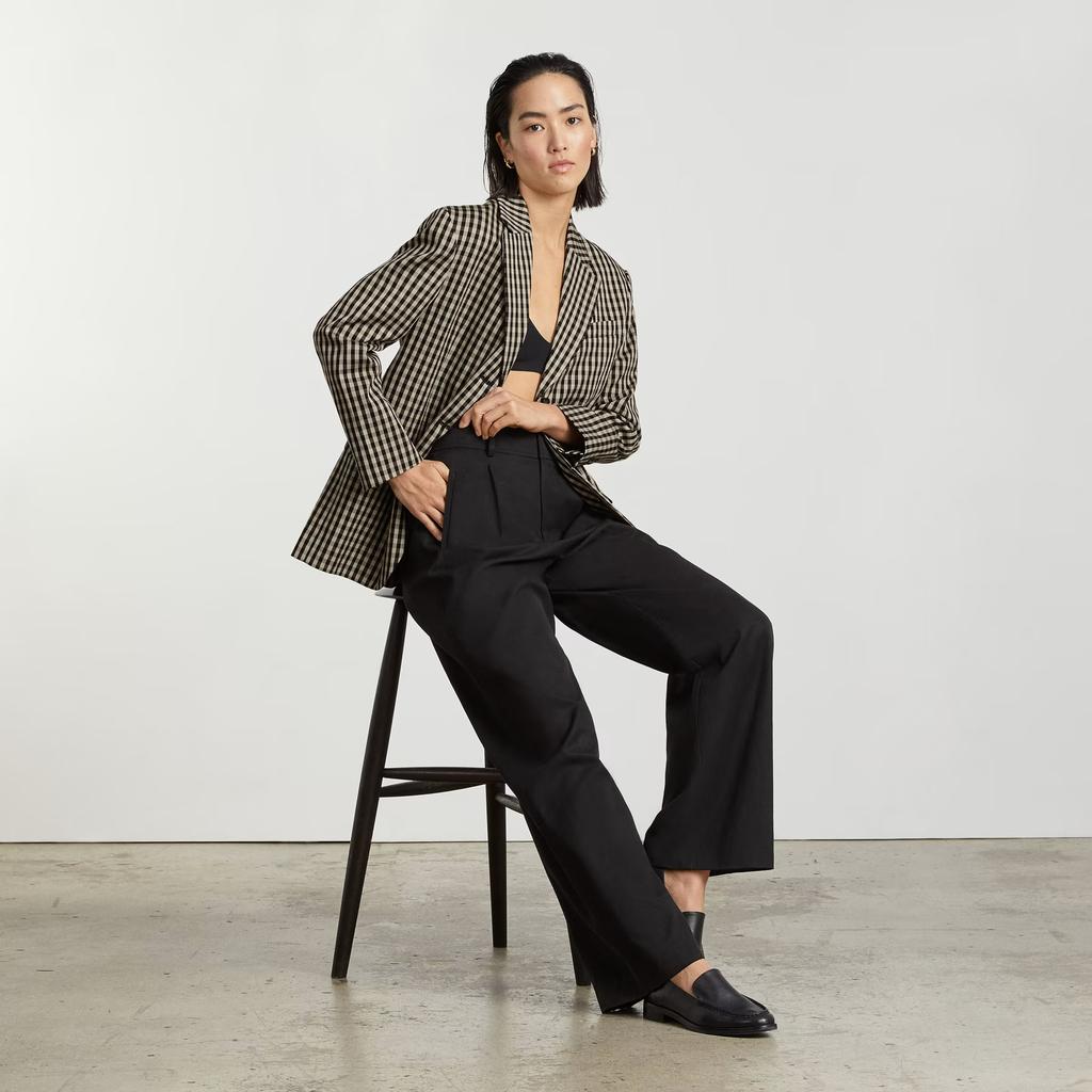 Everlane's 'The Oversized Blazer' has a menswear-inspired, roomy fit. Paired with 'The Way-High Drape Pant,' which features a fluid, wide-leg silhouette, the combination creates a long, elegant line that is both comfortable and commanding. This suit prioritizes movement and ease without sacrificing polish.