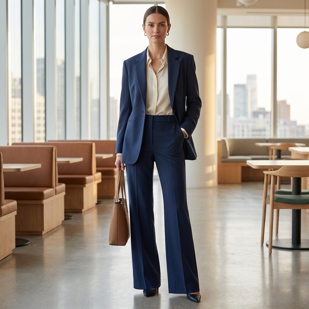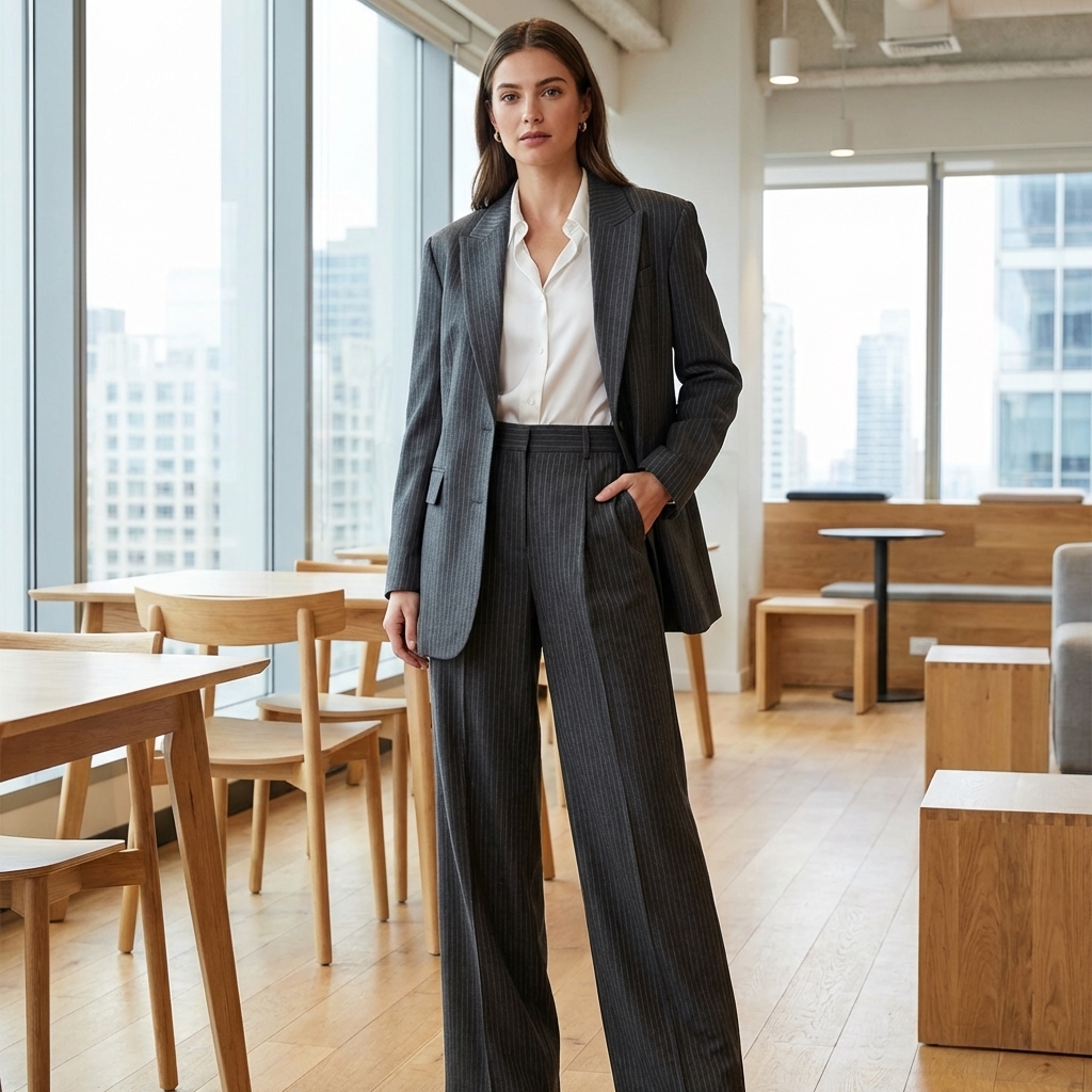The relaxed power suit features a longer blazer with a defined but not constricted waist and broader, softer shoulders. Trousers are typically wide-leg, straight, or have a gentle flare, prioritizing ease of movement.