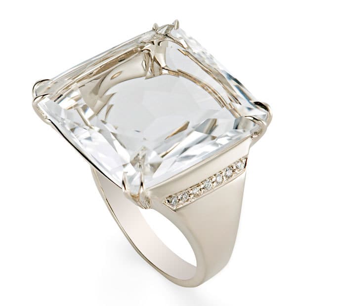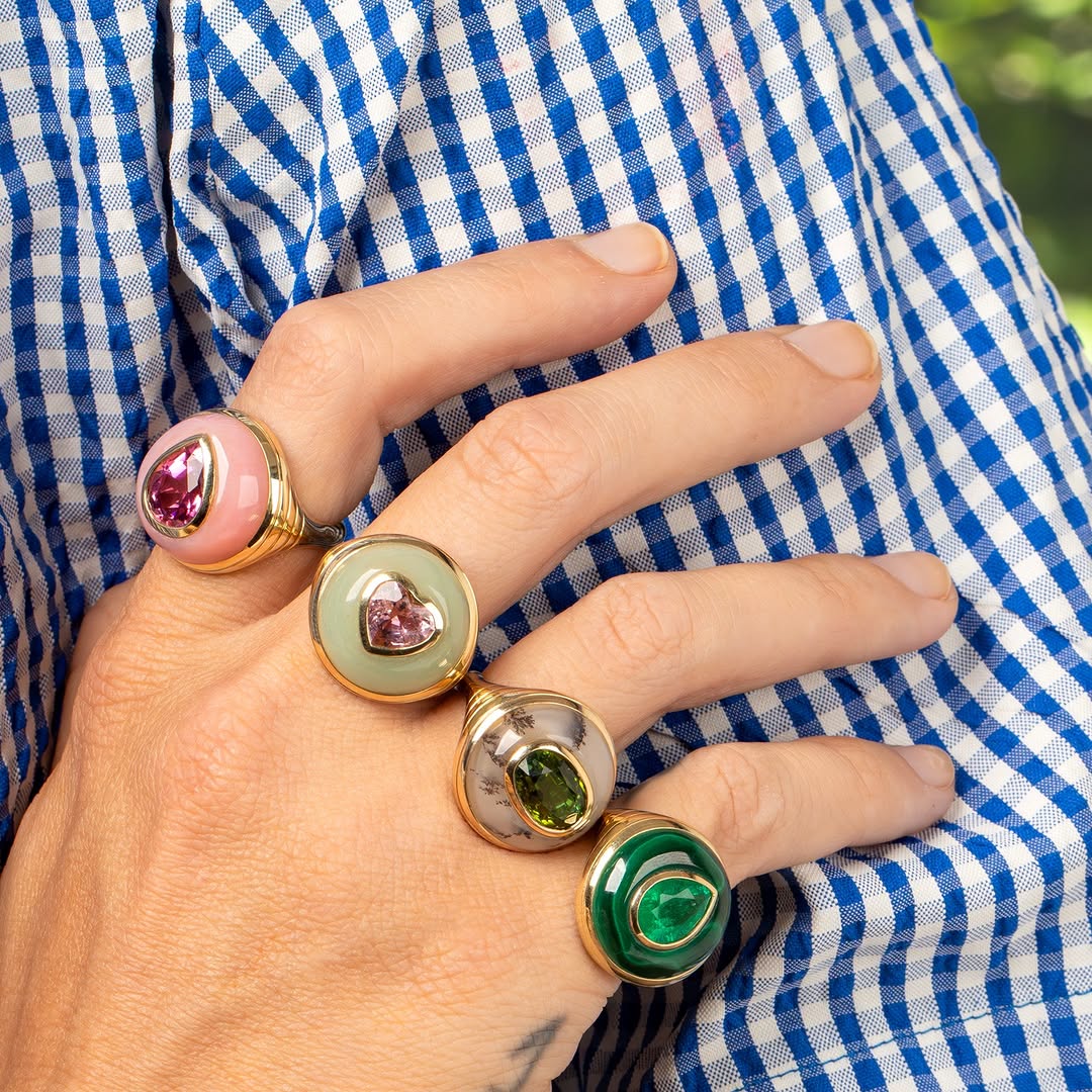 The Rua das Pedras collection by H.Stern is an homage to the charming, cobblestoned streets of Brazil. Rings from this collection are iconic and push the trend by featuring a bold assortment of sizable, often raw or uniquely cut, colored gemstones. The design frequently mixes different gems like amethyst, blue topaz, tourmaline, and quartz in a single piece, set in H.Stern's exclusive 'Noble Gold'—a warm, champagne-toned gold alloy. This juxtaposition of colors and forms creates a statement piece that is both rustic and sophisticated, perfectly capturing the essence of using vibrant, natural stones as a form of personal expression. The collection is celebrated for its organic feel and powerful use of color, making it a top-of-mind example of this trend.