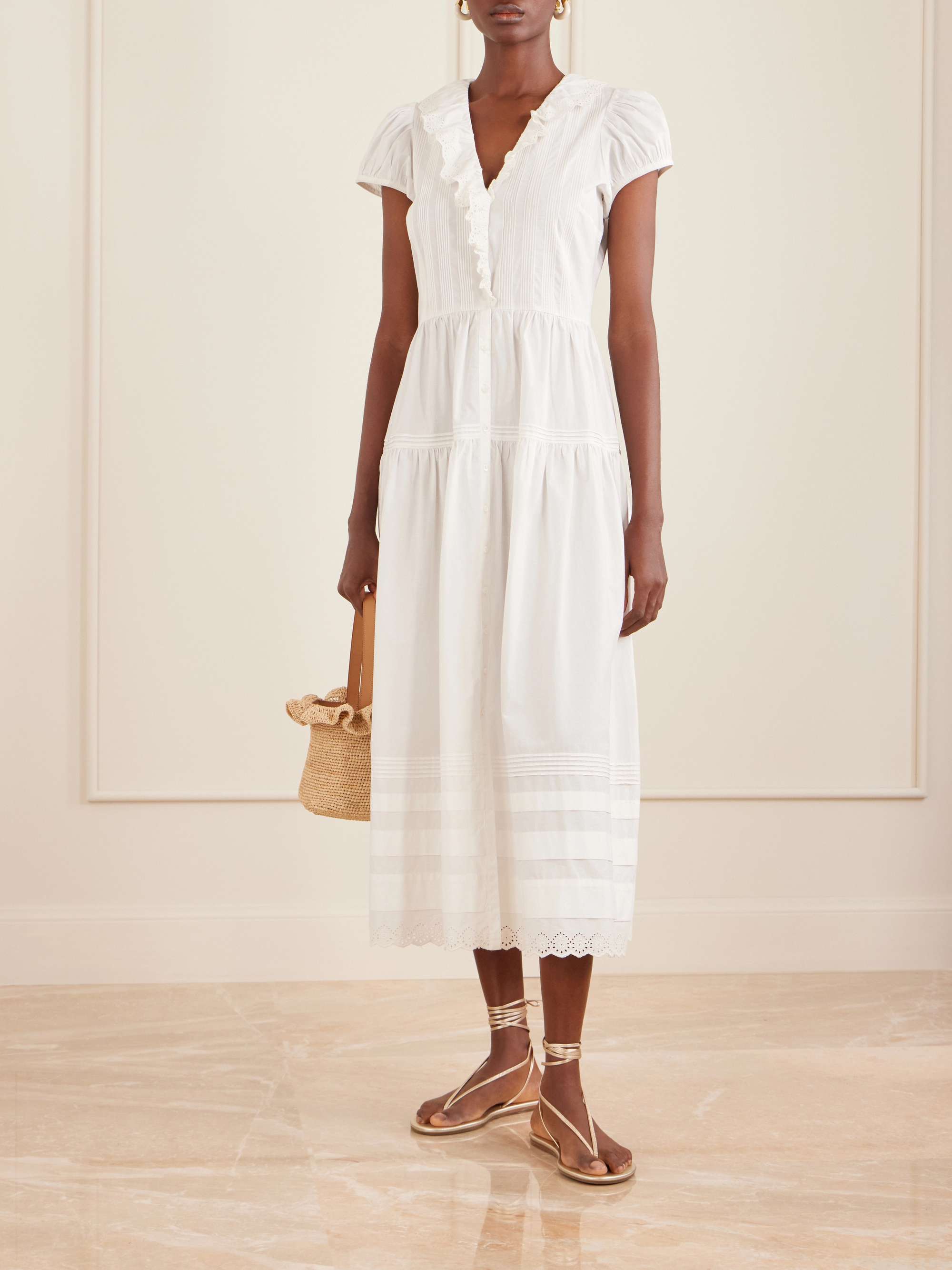 Dôen is renowned for its romantic and vintage-inspired collections that feel like treasured heirlooms. The Eliette Dress is a perfect example, crafted from crisp organic cotton poplin and rich with vintage details. It features an eyelet-trimmed ruffled V-neckline, a fitted bodice with intricate pintucks, and a tiered, ankle-grazing skirt, all of which are hallmarks of vintage prairie and Edwardian styles. A line of buttons down the front completes the look. This dress helps to advance the vintage trend by focusing on high-quality materials and delicate, historical details, creating a piece that is both nostalgic and effortlessly elegant for the modern woman.