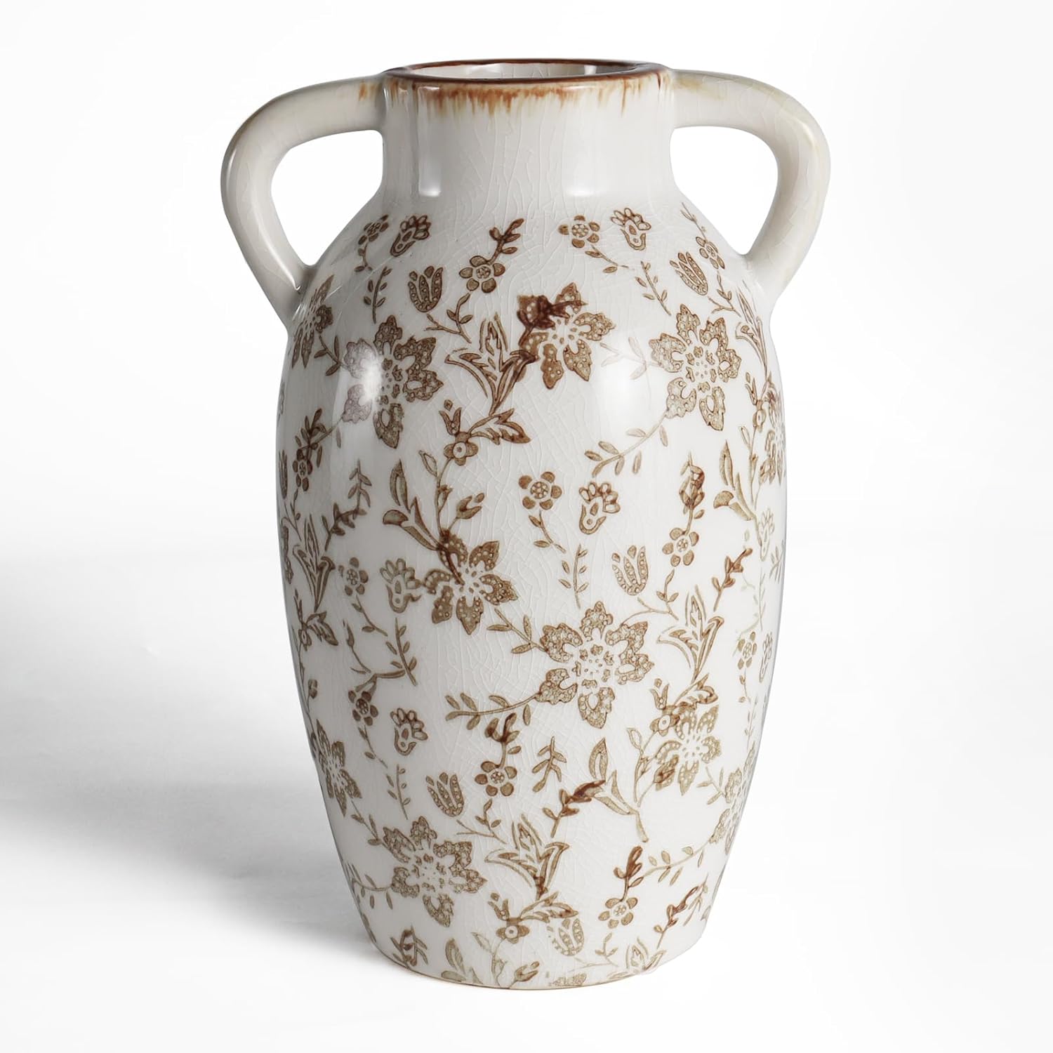 Vintage Ceramic Vase with Handles, 9.45 Inch Crackle Glaze Floral Pattern Vase, Rustic Farmhouse Decorative Flower Vase for Table Centerpieces, Boho & Chinoiserie Home Decor