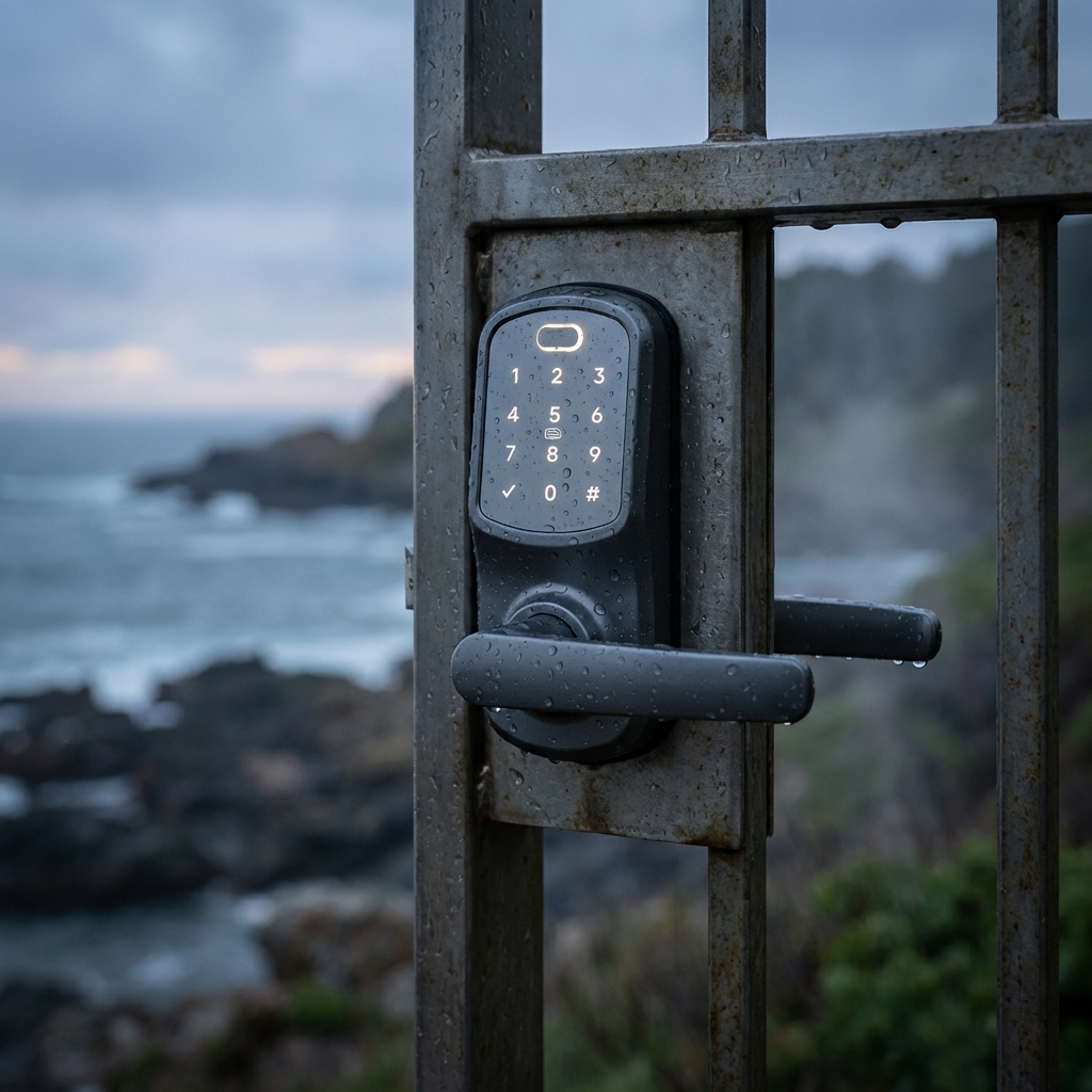 The Aspire V3 from HomeSecure is a digital smart lock specifically designed to be waterproof and withstand various weather conditions, making it highly suitable for outdoor doors and metal gates. It boasts an IP55 weatherproof and fireproof certification, guaranteeing protection from dust and low-pressure water jets. This model pushes the weatherproof trend by combining its durable, corrosion-resistant build with smart features like compatibility with Amazon Alexa and Google Assistant, a high-sensitivity fingerprint reader, and remote management via the TUYA App.