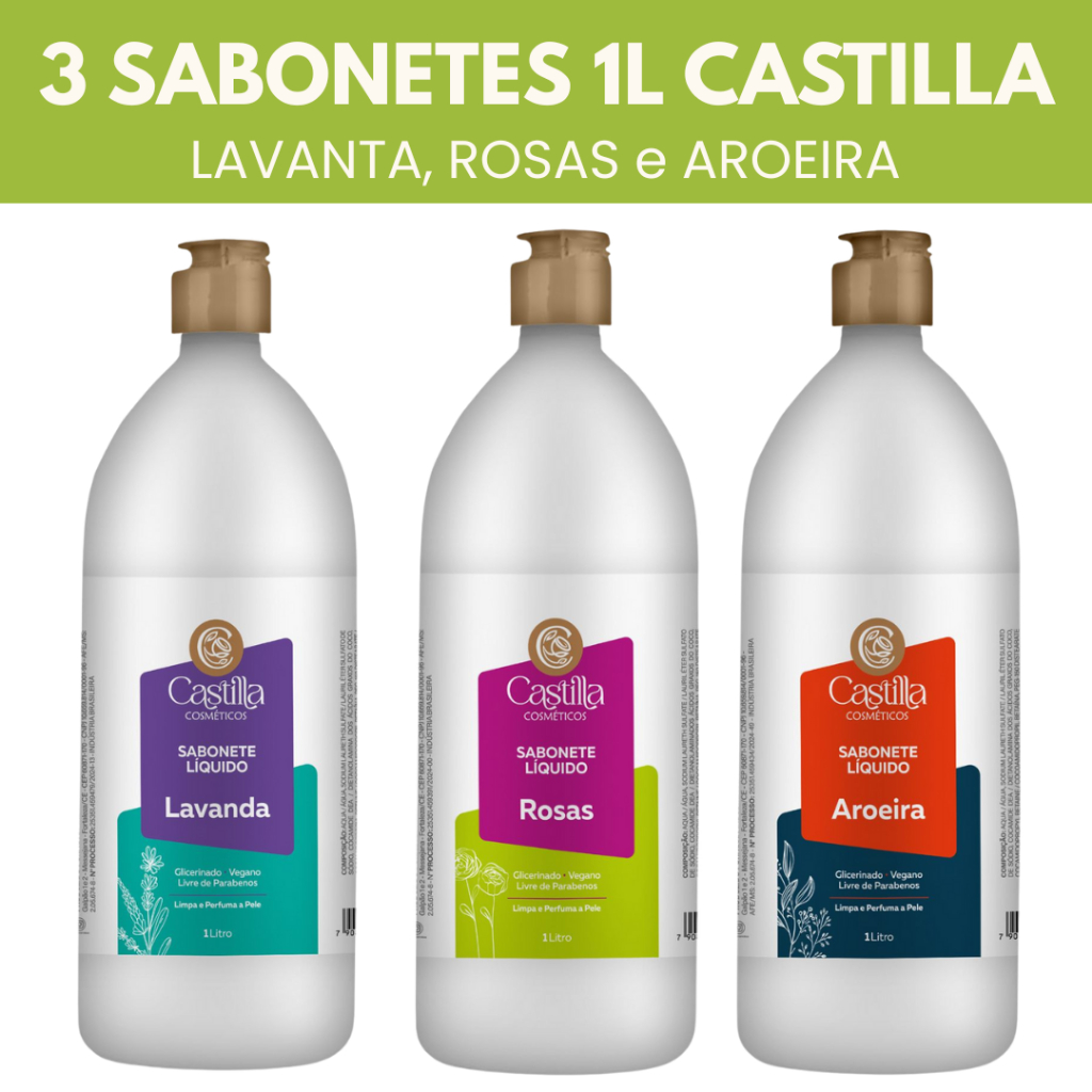 Kit 3 Sabonetes 1L Castilla | Lavanda, Rosas e Aroeira | Veganos Corporal para Toda Família