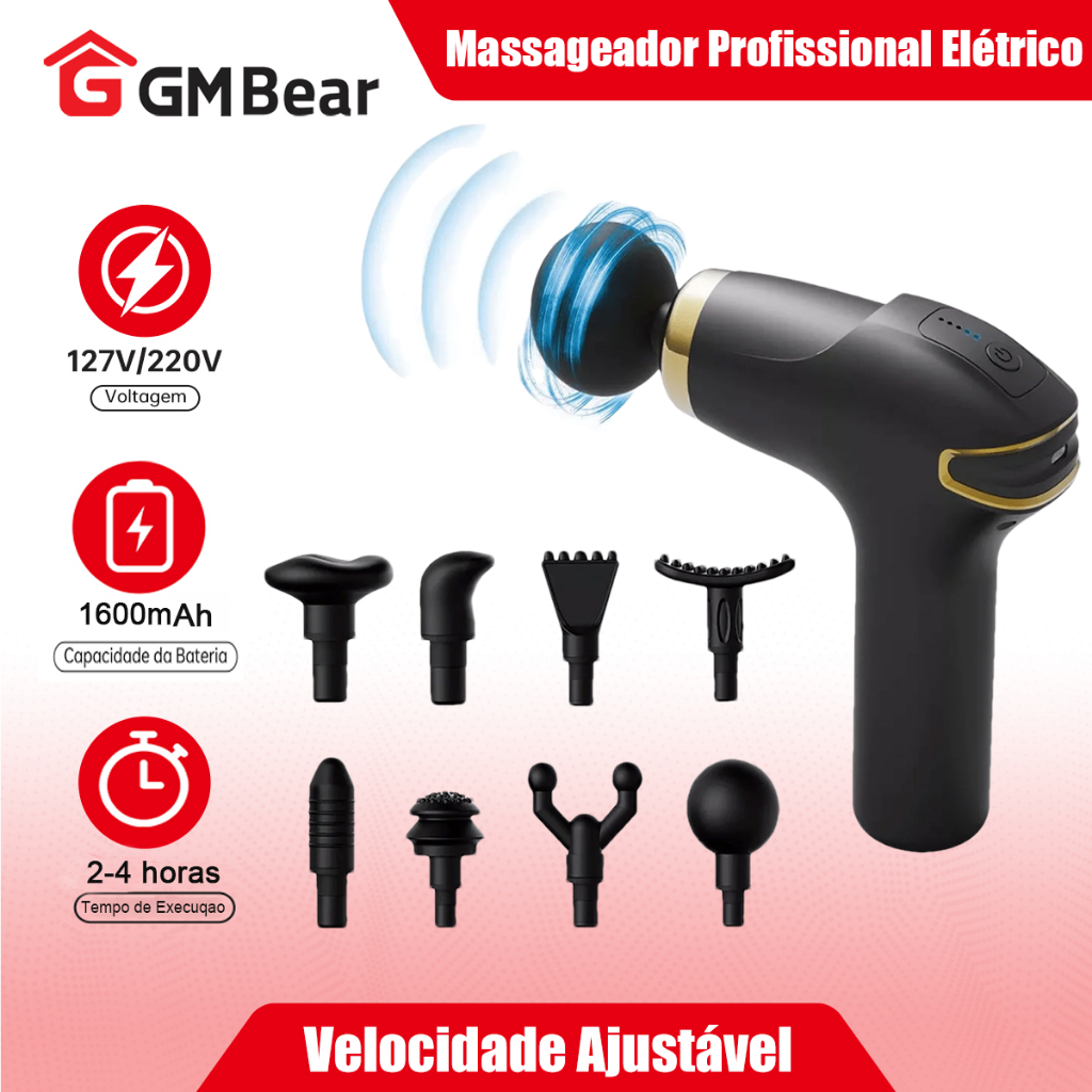 GM Bear Massageador Elétrico Profissional Muscular - Pistola de Massagem Recarregável com 6 Velocidades, Automática