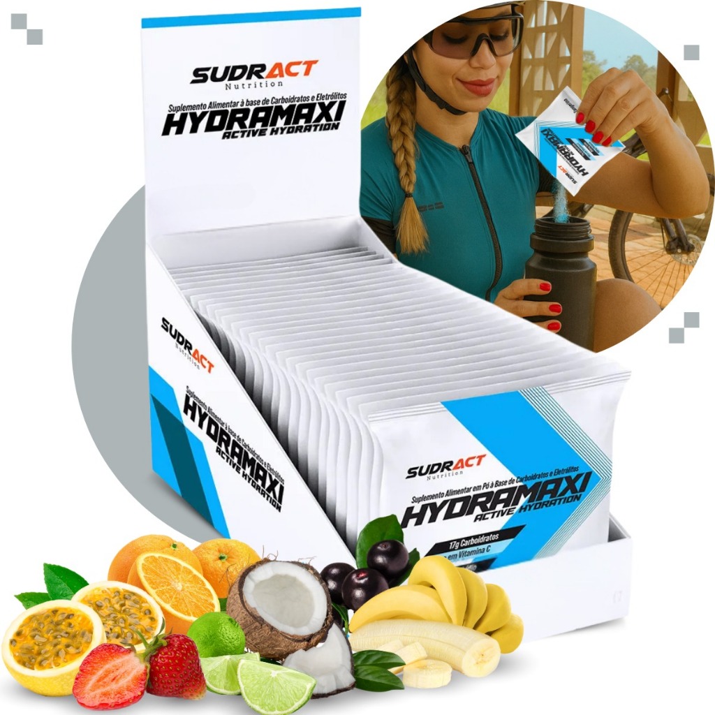 Repositor Isotônico Eletrólitos Hydramaxi Corrida Pedal Display 25 Sachês Sudract Todos Sabores Pó