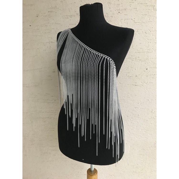 blusa de correntes prata dourado e preto borychain bodychain colar corporal