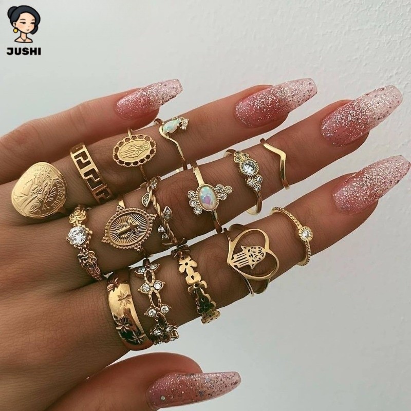 JUSHI Vintage Cameo Coin Cross Hamsa Hand Heart Ring Set 15 Piece Stackable Aesthetic Y2K Jewelry for Women Girls Trendy Gift Idea